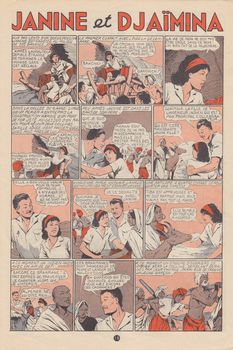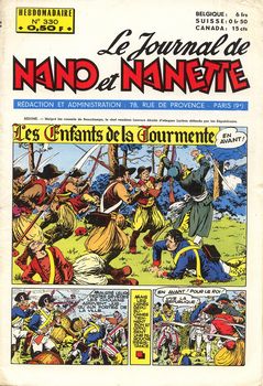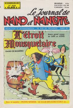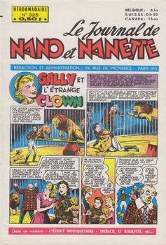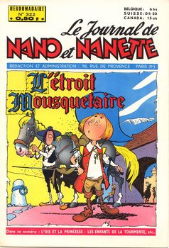 remarques: | le Journal de Nano et Nanette, hebdomadaire, 28 pages au prix de fr 0,50 série de 19 fascicules du no 321 (9.4.1963) au no 339 (13.8.1963) bandes principales: - Nano et Nanette (Rod) - l'orpheline du Far West (Gloesner) n.b. cette bande a été publiée en album - l'étroit mousquetaire (Trubert) - l'oie et la princesse - Aline en Angleterre - Tribacil et Bisulfite (Erik) - les enfants de la tourmente (Le Rallic) - le club des Coui-Coui - Sally et l'étrange clown - petite maman - Sally, la ballerine de cirque - Janine et Djaïmina (Giffey) débute au no 334 pour finir au no 345, la seule et courte série de Giffey publiée dans Nano et Nanette - Fan-fan et ses amis (Marin) >> d'assez bonne fracture avec surtout les bandes de Gloesner, Le Rallic, Trubert, Giffey et Erik, mais beaucoup de bandes dessinées d'origine anglaise, n.b. pas de bandes de Calvo dans ces nos 321 à 339 |