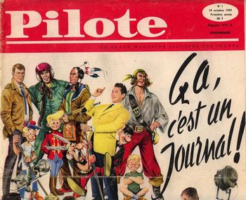 remarques: | Pilote no 1 du 29 octobre 1959, hebdomadaire, le grand magazine illustré des jeunes avec le slogan: ça, c'est un journal édité par S.E.P. Société d'Edition Pilote et lancé par Radio Luxembourg numéro 1, première année, du 29 octobre 1959, 50% couleur, 50% N&B, 32 pages au prix de fr 80.- cette première série se compose de 760 fascicules du no 1 (octobre 1959) au no 760 (mai 1974), une nouvelle série commence en juin 1974 >> voir Pilote Nouveau n.b. il existerait un no zéro signalé dans le no 214 >> tous les numéros ne sont pas collectionnés ici, seul certaines périodes le sont, notamment celles où paraissent les séries de Guy Lebleu non éditées en albums n.b. voir aussi le livre d'or de Pilote >> section albums/étude BD bandes dessinées de ce premier numéro: - Astérix le gaulois (Uderzo+Goscinny) - Michel Tanguy, l'école des aigles (Uderzo+Charlier) - le Démon des Caraïbes (Hubinon-Charlier) - Bison Noir (Lucien Nortier) - P'tit Pat, gamin de Paris (Dagues+Forlani) - Mark Trent, voyage dans le temps (Poïvet) - Jacques Le Gall contre "l'ombre" (Mitacq) - ça va bouillir (Saint-Julien) avec Zappy Max et Kurt von Straffenberg alias le Tonneau et le Pilotorama: un vaisseau du grand siècle (Louis XIV) + l'évasion du Jean Bart (1940) par Henri Dimpre >> un formidable début Information Pilote est un magazine hebdomadaire de bande dessinée français publié d'octobre 1959 à octobre 1989, dans ses premières années, c'est un magazine jeunesse diversifié qui outre de la bande dessinée publie des nouvelles, romans, jeux, blagues et reportages en tous genres, la bande dessinée prend cependant une place de plus en plus importante au milieu des années 1960 et occupe plus de 80% du périodique dès la fin de la décennie, créé par, entre autres, René Goscinny, Albert Uderzo, François Clauteaux, Jean-Michel Charlier, Jean Hébrard et René Ribière, il est racheté par Dargaud dès 1960, ce qui permet de faciliter son développement, destiné aux jeunes adolescents à son lancement, Pilote modernise profondément la presse jeunesse dans les années 1960, avant de s'orienter progressivement vers un public plus âgé, notamment lorsqu'il devient mensuel en 1974, en 1986, Pilote fusionne avec Charlie mensuel pour former Pilote & Charlie, redevenu Pilote en 1988, la revue disparaît l'année suivante, dans un contexte de crise généralisée des mensuels de bande dessinée Pilote a eu une influence déterminante sur la bande dessinée française et sur le marché éditorial français, les fondateurs de l'Écho des savanes, Métal hurlant et Fluide glacial en étant issus, c'est dans cette revue qu'ont été créées de nombreuses séries à grand succès, au premier rang desquelles Astérix d'Albert Uderzo et René Goscinny, Tanguy et Laverdure de Jean-Michel Charlier et Uderzo, puis Jijé, Achille Talon de Greg, Blueberry de Jean Giraud et Charlier et Valérian de Jean-Claude Mézières et Pierre Christin. 21 auteurs réguliers de Pilote ont obtenu le Grand prix de la ville d'Angoulême: Jijé, Jean-Marc Reiser, Fred (Philémon, Timoléon), Giraud/Moebius, Claire Bretécher (Cellulite), Jean-Claude Forest (Hypocrite), Mézières, Jacques Tardi, Jacques Lob, Enki Bilal, Philippe Druillet, Hugo Pratt, René Pétillon, Max Cabanes, Marcel Gotlib (les Dingodossiers avec Goscinny puis la Rubrique à brac), Morris (Lucky Luke avec Goscinny), Gérard Lauzier, Nikita Mandryka (le Concombre masqué), Uderzo, Martin Veyron et Baru, de 1977 à 1994, seuls trois auteurs (Marijac, Paul Gillon et Frank Margerin) récompensés par ce prix n'avaient d'ailleurs collaboré à Pilote que pendant au moins trois ans. Charlier y a également créé avec MiTacq Jacques Le Gall et Goscinny avec Jean Tabary Valentin le Vagabond puis Iznogoud, ont également été publiés dans Pilote le Grand Duduche de Cabu, Norbert et Kari de Christian Godard, sergent Laterreur de Touïs et Frydman, le Génie des alpages de F'Murrr, Jonathan Cartland de Michel Blanc-Dumont et Laurence Harlé qui reçurent le prix du meilleur album de l'année en 1988 au Festival BD d'Angoulème pour l'album: "les Survivants de l'Ombre" et Le Vagabond des limbes de Julio Ribera et Godard, pParmi les collaborateurs réguliers de la revue de 1959 à 1989 figurent également: Martial, Guy Mouminoux/Dimitri, Guy Vidal, Gébé, Jean Mulatier, Alexis, Daniel Billon, Jean-Claude Morchoisne, Yves Got, Patrice Leconte, Jean Solé, Jean-Pierre Dionnet, Sirius, Annie Goetzinger, Philippe Bertrand, Floc'h, Jean-Pierre Gibrat, Jean-Pierre Autheman et Philippe Petit-Roulet depuis l'été 2003, cinq hors-série thématiques de Pilote sous-titrés "Pilote, le journal qui s'amuse à revenir" ont été publiés de manière ponctuelle en fonction de l’actualité, y sont publiés d'anciens auteurs importants du magazine et des auteurs plus contemporains la création l'idée de Pilote naît vers la fin 1958 quand six hommes de presse et de bandes dessinées ont l'idée de créer un journal périodique pour jeunes, ces hommes (Jean-Michel Charlier, Albert Uderzo, René Goscinny, Raymond Joly, François Clauteaux et Jean Hébrard), ont pour ambition de créer une sorte de "Paris Match pour jeune" où, même si la bande dessinée doit jouer un rôle important, elle ne doit pas représenter l'intégralité du journal et doit côtoyer les grands sujets d'actualité, le premier titre avancé pour ce nouveau journal est Champion du nom d'une émission pour les jeunes diffusées sur Radio-Luxembourg, le nom de Pilote est finalement décidé après réflexion une première maquette est réalisée par Édifrance, sur les bases du fascicule mort-né Supplément Illustré publié par cette même maison d'édition, au sommaire de cette maquette notamment une adaptation en bande dessinée du Roman de Renart par Albert Uderzo et René Goscinny, mais ce projet tombera à l'eau quand Raymond Poïvet les informe que Jean Trubert travaille sur 