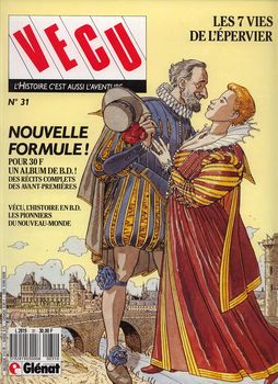 remarques: | 7 fascicules du no 29 (septembre 1987) au no 35 (janvier 1989) avec comme bandes principales: - chroniques de la maison Le Quéant (Jusseaume) - tours de Bois-Maury, Reinhard (Hermann) - la fortune des Fugger (Giroud) - le voyage du bateleur (Autheman) - de silence et de sang (Malès) - Milosz, Saint-Petersbourg (Cordonnier) - Timon des Blés, les insurgents (Arnoux) - les veines de l'Occident (Boilet) ce no 29 est un fascicule géant où tous les épisodes se terminent pour annoncer un nouveau format et Vécu passe en magasine bimestrielle, c'est la première fois que nous avons un récit complet en couleur, et il y a une particuliarité dans ce numéro de Vécu: une histoire courte dont le titre est: la Révolution, enfin écrite par D.Bardet et dessinée par P.Jusseaume qui commence par le dessin d'une magnifique maison avec une tour et quelques pages plus loin (page 27) vous trouvez le même batiment dessiné par Y. Swolf dans la série Dampierre l'Aube noire; il semble que les dessinateurs travaillent avec les même bases de données photos bandes principales de ce nouveau format: - la Révolution, enfin (Dethorey) - les aventures de Giacomo (Griffo) - Dampierre, l'aube noire (Swolfs) - les 7 vies de l'épervier, Hyronimus (Juillard) - les pionniers du Nouveau Monde (Charles) - Rebecca, une question de nez (Brandoli) - les héritiers du soleil (Convard) - les aigles décapités (Kraehn) - poupée d'ivoire (Franz) - Margot, l'enfant bleue (Son) >> un nouveau format assez bien réussi annexes les meilleures couvertures |