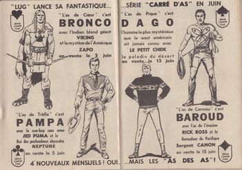 remarques: | numéro 165 du 5.5.1965 - Miki le ranger, le fils du héro - Tahy Tim, 8ème épisode (aventure) - Tex le ranger, l'exécution de Black Jack Ketchum n.b. bande annonce dans le fascicule pour la série "carré d'as": - l'as de coeur = Bronco l'indien blond géant - l'as de trèfle = Pampa le cowboy - l'as de pique = Dago l'homme mystérieux - l'as de carreau = Baroud l'as de l'évasion >> la série Miki le ranger devient de plus en plus une bande humoristique avec de courts épisodes d'humour contenus dans le fascicule, la série Tex Willer restant la seule bande digne d'intérêt |