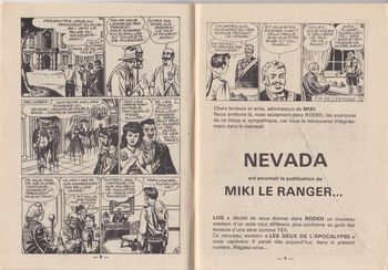 remarques: | fin des aventures de Miki le ranger qui continuent dans la série Nevada - Tex Willer le ranger, la défaite de Renard Rouge - les deux de l'apocalypse (western genre Zorro) n.b. c'est ainsi que l'on désigne Calvario et Sonora, les deux hardis guerilleros mexicains qui luttent farouchement contre l'usurpateur autrichien Maximilien et ses soldats impériaux >> dans le mensuel Rodeo, il ne reste donc plus que la série de Tex Willer (qui n'est plus autant intéressante qu'auparavant) agrémentée de la nouvelle série des "deux de l'apocalypse", récit sans grand intérêt, mais qui devrait captiver le lecteur selon la bande-annonce, série qui continue jusqu'au numéro 320 de Rodeo |