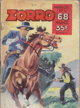 remarques: | le personnage de Zorro, le justicier masqué, deviendra un sujet célèbre dans plusieurs bandes dessinées, en petit format notamment chez SNPI et SFPI de 1954 à 1968, n.b. SNPI (Société Nationale de Presse Illustrée) et SFPI (Société Française de Presse Illustrée) font partie du groupe Jean Chapelle >> voir aussi Récit Complet et Périodiques André Oulié (1898-1996) est connu pour avoir été le premier dessinateur français de Zorro et le créateur de Robin l'intrépide. on distingue deux séries de PF - 1ère série (SNPI), du no 15 (6-1954) au no 35 (2-1956) pour les numéros antérieurs à 15 >> voir RC - 2ème série (SFPI), marquée nouvelle série du no 1 (3-1956) au no 153 (2-1968) n.b. une 3ème série est parue par SFPI du no 1 (3-1968 au no 107 (2-1977), mais non collectionnée ici et par la suite d'autres séries verront le jour publiées par de nombreux éditeurs divers de 1980 à 1986 n.b. dans les séries SNPI et SFPI on distingue 2 genres de Zorro: dessiné d'abord avec un masque complet tombant jusqu'au menton, puis dessiné avec un masque-loup (seulement pour les yeux) no 15, juin 1954, mensuel, 68 pages, 35.- fr imprimé en alternance en bichromie (1 page N&B, 1 page noir et rouge) - Zorro, le tueur (western) - Red Ryder et Petit Castor (western) by Fred Harman ** - prisonnier de l'orang (aventure) - O'Brien agent secret (guerre) by Jean Pape ** ** les meilleurs récits Information Zorro (mot qui signifie "renard" en espagnol) est un personnage de fiction créé en 1919 par Johnston McCulley (1883-1958): c'est un justicier masqué vêtu de noir qui combat l'injustice en Californie mexicaine, ce personnage a inspiré des romans, des bandes dessinées, des films, des séries télévisées, des dessins animés, des jeux et d'autres héros masqués tels que Batman chez DC Comics (du propre aveu du dessinateur Bob Kane1) ou El Aguila chez Marvel Comics le 9 août 1919, est publiée dans la gazette illustrée américaine All-Story Weekly une histoire sous forme de feuilleton intitulée le fléau de Capistrano (the Curse of Capistrano) écrite par Johnston McCulley, le personnage de Zorro y apparaît pour la première fois, très vite, l'histoire sera publiée sous forme de roman en 1924 sous le titre de le signe de Capistrano, puis sera republiée sous le nouveau titre de le signe de Zorro (the mark Of Zorro), c'est un très grand succès, qui est très vite adapté au cinéma dès 1920 avec le signe de Zorro (the mark of Zorro) dans lequel Douglas Fairbanks, la grande star de l’époque, joue le rôle de Zorro avec son fouet qui laisse la marque Z, le film connaît un tel succès que, en réponse à la demande publique alimentée par le film, Johnston McCulley écrira plus de soixante aventures supplémentaires de Zorro dès 1922, la dernière, the mask of Zorro, a été publiée un an après la mort de l’auteur, en 1959, si le fléau de Capistrano, la toute première aventure de Zorro, révélait l'identité du justicier masqué à la fin, les aventures suivantes qu'écrira l'auteur garderont, quant à elles, son identité toujours secrète le personnage de Zorro a été adapté en bande dessinée en France dès 1939 dans Jumbo, ses animateurs les plus connus furent André Oulié (1947-1967) et Eu. Gire (1949), dans des périodiques pour enfants et des petits formats, de 1974 à 1986, le Journal de Mickey publia des histoires inédites dues pour la plupart à Robert Rigot puis Carlos Marcello (dessin) et Jean-Marie Nadaud (scénario), création de nombreux films télévisés et de films à long métrage. le personnage a été utilisé en Italie à partir de 1940, des planches de Pier Lorenzo De Vita et Giuliano Giovetti furent publiées dans le Journal de Mickey entre 1968 et 1970, de 1964 à 1967 Hans Kresse (dessin) et Joop Termos (scénario) proposèrent des histoires inédites aux lecteurs de l'hebdomadaire jeunesse néerlandais Pep. aux États-Unis, des histoires de Zorro apparaissent dans Four Color à partir de 1949, de 1958 à 1961, de nombreuses histoires adaptées de la série télévisée de 1957-1961 furent publiées, certaines dessinées par Alex Toth et Warren Tufts, plusieurs de ces histoires furent reprises dans le Journal de Mickey entre 1958 et 1978, de nombreux comic books éphémères ont été créés dans les années 1990 et 2000 la version de Walt Disney diffère quelque peu des écrits de Johnston McCulley, notamment par le fait que l'action se déroule durant la période coloniale, alors que le roman la situe durant la période mexicaine (1821-1846), l'action se déroule au début du XIXème siècle à Los Angeles et dans les villages environnants, au retour d'Espagne où il faisait des études, Don Diego de la Vega, fils du respectable notable Don Alejandro de la Vega, décide de se faire justicier afin de prendre la défense des citoyens, et en particulier de son ami Don Ignacio Torres, emprisonné, face à la tyrannie exercée par la garnison aux ordres du commandant Monastorio, afin de parfaire son camouflage aux yeux de ses ennemis, le jeune héros cherche à dissimuler son habileté à l'escrime et se fait passer pour un érudit n'appréciant absolument pas les combats ni la politique, de plus, son fidèle serviteur muet, Bernardo, est également présenté comme sourd, afin de lui permettre de flâner aux abords des personnes à épier, en faisant croire qu'il ne comprend pas de quoi elles dialoguent, Zorro est accompagné de son cheval Tornado, un superbe étalon noir qu'il avait dressé avant son voyage d'études et il possède aussi un cheval blanc nommé Phantom, le justicier se vêt entièrement de noir de pied en cap, porte un loup en tissu ne lui cachant que la partie supérieure du visage et se coiffe d'un chapeau rigide à large bord de même couleur, le jeune homme se choisit un nom qu'il "signe à la pointe de l'épée, d'un Z qui veut dire Zorro" il ne perd pas une occasion de ridiculiser le sergent D