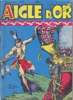 remarques: | Aigle d'Or est une revue mensuelle de l'éditeur SFPI, 35 numéros de février 1956 à décembre 1958, format 13x18 cm, N&B, 100 pages, prix 0,40 fr,. BD western dessinée par un auteur espagnol anonyme, le mensuel est complété souvent par un grand récit complet de Pierre Dupuis seul le no 1 est collectionné ici à titre d'exemplaire représentatif de la série Aigle d'Or, numéro 1 de février 1956 Aigle d'Or, membre de la tribu des castors, ses parents: le chef Jewo et sa femme Plume Blanche. Briscola, son compagnon-trappeur avec son juron favori: par la pipe de ma grand-mère! - le duel (humour) - le trésor (aventure) - Mic a soif (humour) >> des aventures de qualité moyenne |