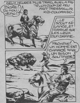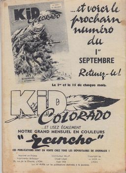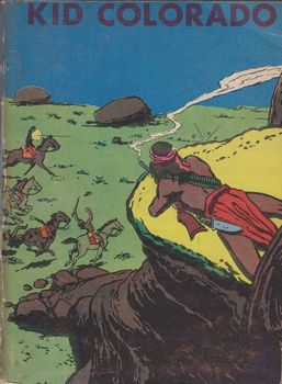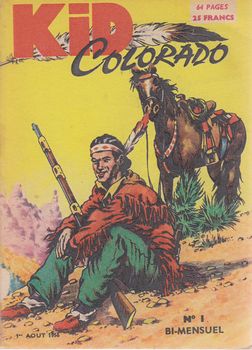 remarques: | série de 28 numéros de 8-1956 à 10-1957, bi-mensuel, N&B, 64 pages, au prix 0,25 fr >>> n.b. voir aussi les autres séries de ce genre sous Colorado >> seuls les 5 premiers numéros sont collectionnés ici à titre d'exemplaires représentatifs de la série Kid Colorado, reliure contenant 4 fascicules avec leurs couvertures bien présentes dans la reliure a) Kid Colorado no 1 du 1.8.1956 - Kid Colorado, un éclaireur comanche au service des oprimés, 2 épisodes: les 4 flèches apaches et la charge de fort St-Louis b) Kid Colorado, no 26 du 15.8.1957 - Kid Colorado, poursuite dans les marais c) Big Horn, numéro 4 du 5.2.1958 (même éditeur que Kid Colorado) avec - Big Horn alias Casey Ruggles, son fils adoptif Petit Renard et le trappeur Kit Carson dans Big Horn retrouve son père - Kid Colorado avec son compagnon Breack dans le club des trois - Kevin le Hardi, aventures au Moyen Age d) Big Horn numéro 5 de mars 1958 avec - Big Horn, le jugement de Petit Renard - Kid Colorado, danger à bord - Kevin le Hardi et son petit protégé >> une reliure disparate avec des aventures plutôt réalistes et assez bien dessinées, surtout celles avec Kid Colorado annexes - couverture de la reliure - 1et et 4ème plat du numéro 1 de Kid Colorado - une planche de Kid Colorado |