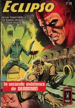 remarques: | Eclipso, numéro 11, d'octobre 1970 - la seconde existence de Deadman - Dynamo l'agent secret du Thunder, se marie - Dynamo contre Noman, un agent invisible de la Thunder - Noman, le baiser de la mort - sur la piste de "l'araignée", l'ennemi de la Thunder - le dernier exécuteur - le Pacifique, homme d'action, les survivants - docteur 7, roi du surnaturel, le retour de Morlooo >> un cahier surtout dédié à la Thunder n.b. il existe aussi aux éditions Remparts une série intitulé Tonnerre (pour Thunder), 10 nos (1967-1968) Information - T.H.U.N.D.E.R. Agents est une bande dessinée américaine créée par Wallace Wood pour le compte de la maison d’édition Tower Comics (1965-1969), cette série allie à la fois le concept des super-héros et celui de l’espionnage, disparue après la déconfiture de Tower Comics, cette série a, malgré sa brièveté, marqué son lectorat, il fut ainsi question de la reprendre chez Atlas/Seabord au milieu des années 70 ou encore pour la revue Penthouse, ce fut finalement le cas chez JC Comics puis De Luxe Comics et enfin DC entre temps la fameuse collection DC Archives a réédité les épisodes originaux en 7 tomes qui se sont littéralement arrachés - T.H.U.N.D.E.R. Agents is a fictional team of superheroes that appeared in comic books originally published by Tower Comics in the 1960s, they were an arm of the United Nations and were notable for their depiction of the heroes as everyday people whose heroic careers were merely their day jobs, the series was also notable for featuring some of the better artists of the day, such as Wally Wood, the team first appeared in T.H.U.N.D.E.R. Agents #1 (cover-dated Nov. 1965), the name is an acronym for "The Higher United Nations Defense Enforcement Reserves" |