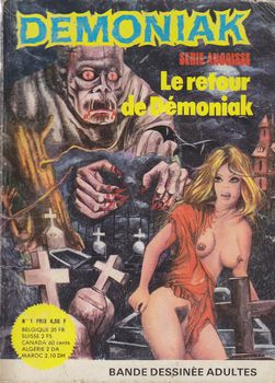 remarques: | série de 2 numéros uniquement (1977), série angoisse, N&B, 114 pages au prix de 4,0 fr mais un graphisme très rudimentaire et avec le prix ci-dessus, on comprend que la revue n'ait pas fait de vieux os malgré une couverture assez alléchante! Demoniak no 1 de 1977 - le retour de Demoniak n.b. il y eut quelques autres séries avec le titre Demoniak: - 9 numéros dessinés par Magnus, 1ère série, une histoire de démons, - 4 numéros dessinés par Magnus, 2ème série toutes deux édition de Poche (1967) - 4 numéros aux éditions Fremok (2009) annexes - 1er plat du no 1 - une couverture de Demoniak par Magnus Information Demoniak appelé aussi Satanik fut aussi une série italienne de bande dessinée érotique d'aventure créée par le dessinateur Magnus et le scénariste Max Bunker et publiée entre décembre 1964 et novembre 1984 dans un mensuel homonyme, après le départ de Magnus en 1970, différents auteurs s'y sont ensuite relayé comme le nom Satanik était déjà utilisé en France pour une série de romans-photos publiée en Italie sous le titre de Killing, Satanik y a été traduit de diverses manières: Démoniak, Desdémone, Fédora, Marny Bannister, Satanas, Satanix, etc le personnage principal est une vieillarde repoussante car défigurée qui découvre une formule la rendant jeune et belle: elle devient aussitôt une criminelle assoiffée de revanche sur le monde et prend le nom de Satanik elle est poursuivie en vain par la police, la série se distingue par une débauche de violence un film italien fut réalisé en 1968 par Piero Vivarelli, avec Magda Konopka dans le rôle de Demoniak |