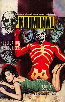 remarques: | Kriminal est une série de bande dessinée italienne, dessinée par Magnus et scénarisée par Max Bunker, publiée entre 1964 et 1976 le personnage et la série ont parfois été rebaptisés Krimi dans certaines éditions françaises inspiré de Diabolik - qui est lui-même inspiré de Fantômas - Kriminal est un criminel portant un masque et une combinaison de squelette, guidé par la revanche contre les criminels qui ont poussé son père à se tuer, Kriminal devient ensuite un cambrioleur que l'inspecteur Milton tente continuellement d'arrêter, Kriminal a pour complice l'ex-femme de Milton. la série se distingue par une violence extrême pour l'époque, Kriminal se montrant un assassin parfois sadique, et un érotisme certain, la censure italienne sévit plusieurs fois à l'encontre de l'éditeur, au fil des épisodes, de criminel implacable, le personnage devient plus proche d'un héros tel qu'Arsène Lupin deux films, Kriminal et le retour de Kriminal, furent tournés en 1966 et 1967, réalisés par Umberto Lenzi et par Fernando Cerchio, l'acteur néerlandais Glen Saxson interprétait le rôle-titre, Kriminal y est un génie du mal rampant, grimpant les façades d’immeuble la nuit, souple et félin, Lenzi a su capter cette image inquiétante tout en gardant l’aspect fun et détaché de la bande dessinée, il dynamise le récit en apportant quelques petites touches d’humour bienvenues, il se révèle cruel, parfois, mais pour mieux s’ingénier à brouiller les pistes, quelques personnages un peu retors (dont Dante Posani, qui œuvra pour Jess Franco dans Lucky l’intrépide) donneront matière à déceler une certaine marque de fabrique chez Umberto Lenzi ainsi que le goût de la tromperie (un mannequin pris pour un humain qui rappelle le subterfuge utilisé dans Spasmo) n.b. spasmo = un giallo au scénario malin qui s’enfonce progressivement dans les spirales de la paranoïa pour mieux détourner les règles du genre le giallo est un genre de film d'exploitation, principalement italien, à la frontière du cinéma policier, du cinéma d'horreur et de l'érotisme Kriminal, 1ère série, numéro 1 de décembre 1966 le roi du crime, la vengeance de la Conque Bleue pour les actionnaires de la socété pétrolière irlandaise, l'habillement de Kriminal: une combinaison dessinée en squelette, mais Kriminal peut user de nombreux autres déguisements pour approcher ses victimes il est pourchassé souvent sasn succès par l'inspecteur Milton >> p. 47 la voiture de Kriminal: une Jaguar >> des scénarios assez rudimentaires avec un dessin non plus pas trop recherché, un genre peut'être original mais qui n'a rien de particulier sinon les couvertures des fascicules bien exécutées Information né à Bologne en 1939, Roberto Raviola réalise ses premières bandes dessinées en 1958, mais c'est en 1964, après avoir fréquenté l'Académie des Beaux-Arts et tâté divers métiers, que Magnus, comme il signe à présent, entre véritablement dans la carrière avec la rencontre du scénariste Luciano Secchi, alias Max Bunker, en onze ans, ils vont créer une myriade d'anti-héros couvrant tous les genres, de Jézébel l'amazone de l'espace au comique Alan Ford, mais c'est dans la BD sexy qu'ils s'affirment particulièrement, avec des séries comme Kriminal et Satanik, à partir de 1975, Magnus se consacre à des projets plus personnels, alternant aventure contemporaine, avec notamment le sérial Lo Sconosciuto (auquel il se consacrera jusqu'à sa mort en 1996), et fantaisies orientales, avec les Brigands (adapté du roman chinois au bord de l'eau) ou les 110 pilules, sommet de l'érotisme qui sera son best-seller, en 1981, l'éditeur Edifumetto lui propose de dessiner un nouveau personnage sur des textes de Ilaria Volpe, conçu au départ comme un porno-horreur dans la ligne de la maison, Nécron va vite être transfiguré par la ligne claire de Magnus, son outrance et son art de bouleverser les lois du genre, à partir de 1989, il entame un travail qui durera jusqu'à sa mort, en 1996, sur la série Tex, dont il dessinera un épisode de 224 pages ses séries principales: Kriminal, SS 018, Demoniak, Jezabel, Desdemone, Borgia, Genius, la Louve, Cormoran, Dilemme, Navaje, Tantale, Alan Ford, Demona, le rayon Lambda, Krimi super police, Satanix, Necron, Diva, Milady 3000, Tex spécial Clair de Lune |