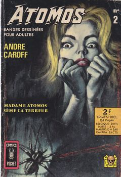 remarques: | Atomos, numéro 2 de février 1969 - Mme Atomos frappe à la tête, - des yeux diaboliques - crime au musée des horreurs - les cloches ensorcelées commentaires Mme Atomos: voir section livres, la série Atomos, collection Angoisse, édition Fleuve Noir, 17 volumes par André Caroff >> ces récits en bande dessinée sont une assez fidèle adaptation des romans d'André Caroff sur Mme Atomos, toutefois si le dessin est bien exécuté, la bande dessinée ne reproduit pas aussi bien le suspense dégagé en lisant les romans sans illustrations |