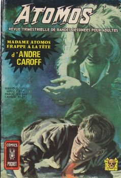 remarques: | Atomos, numéro 3 de mai 1969 - Mme Atomos frappe à la tête - Zip Nolan, le crieur de journeaux - l'ascenseur diabolique - le sinistre parchemin - le possédé - conte d'une sorcière dans le vent commentaires Mme Atomos: voir section livres, la série Atomos, collection Angoisse, édition Fleuve Noir, 17 volumes par André Caroff >> ces récits en bande dessinée sont une assez fidèle adaptation des romans d'André Caroff sur Mme Atomos, toutefois si le dessin est bien exécuté, la bande dessinée ne reproduit pas aussi bien le suspense dégagé en lisant les romans sans illustrations |