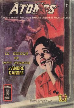 remarques: | Atomos, numéro 8, d'août 1970 - le retour de Mme Atomos - l'ultimatum - le détective sans visage - numéro 13 commentaires Mme Atomos: voir section livres, la série Atomos, collection Angoisse, édition Fleuve Noir, 17 volumes par André Caroff >> ces récits en bande dessinée sont une assez fidèle adaptation des romans d'André Caroff sur Mme Atomos, toutefois si le dessin est bien exécuté, la bande dessinée ne reproduit pas aussi bien le suspense dégagé en lisant les romans sans illustrations |