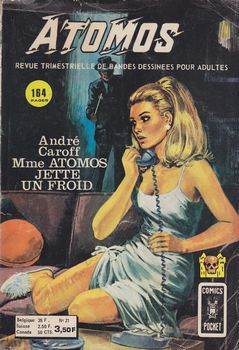 remarques: | Atomos, numéro 21 d'octobre 1973 - Mme Atomos jette un froid part 1) - esprits frappeurs - la poupée des désirs - derrière le mur commentaires Mme Atomos: voir section livres, la série Atomos, collection Angoisse, édition Fleuve Noir, 17 volumes par André Caroff >> ces récits en bande dessinée sont une assez fidèle adaptation des romans d'André Caroff sur Mme Atomos, jusqu'au numéro 11, ces aventures bénéficiaient d'un graphisme bien étudié, mais dès le no 12, changement de dessinateur avec un graphisme vraiment peu recherché, ce qui rend les cahiers bien moins intéressants malgré que à partir du no 15, le graphisme redevient meilleur sans toutefois égaler les illustrations des 11 premiers numéros alors que la bande dessinée ne reproduisait déjà pas aussi bien le suspense des romans de la collection angoisse |