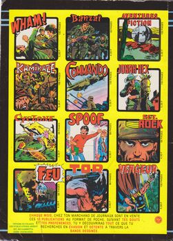 remarques: | série de 18 numéros de 2-1984 à 7-1986 reliure des nos 1 à 4, mensuel, 68 pages au prix de 3,50 fr bande principale: King Cobra c'est la suite de Meteor 2ème série en petit format 96 fascicules, nos 111 (7-1962) à 206 (8-1977) >> carton100A >> seuls les 4 premiers numéros sous forme de reliure sont collectionnés ici à titre d'exemplaires représentatifs de la série numéro 1 de février 1984 - le dévastateur, sous l'égide du dr Doom - l'or de fort Knox numéro 2 d'avril 1984 - le dévastateur, l'ennemi de la terre - pénurie mondiale numéros 3 de juin 1984 - King Cobra - la fin d'un pouvoir numéro 4 d'août 1984 - King Cobra, les démons volants - la planète abandonnée - des récits de science-fiction mais plus rien à voir avec les 2 premières séries de Meteor annexes - 1er et 4ème plat de la reliure - couverture du no 1 de Meteor 3ème série |