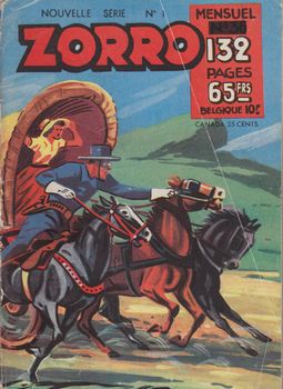 remarques: | Zorro 2ème série (nouvelle série), éditeur SFPI, mensuel, 132 pages, prix 65.- fr, en bichromie (N&B+rouge) comme la première série 153 numéros, du no 1 (mars 1956) au no 153 (février 1968) n.b. seuls sont collectionnés ici les 33 premiers numéros + quelques numéros éparses jusqu'au no 153 une série de qualité équivalente à la première série, pratiquement avec les mêmes bandes dessinées, les dessins sont peut'être parfois un peu moins recherchés no 1, mars 1956 - Zorro, au coq-vert by Oulié - MacGalland, les monstres de Kingman (aventure) by Dupuis ** - le chasseur blanc - Lucky Bold (western humour) by Randenen ** - Red Ryder et Petit Castor (western) ** - O'Brien, S.O.S. au Labrador (espionnage) by Pape ** ** = les meilleurs récits n.b. ce cahier classé BE+ car la première page de couverture montre une pliure, autrement cahier en TBE |