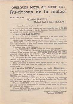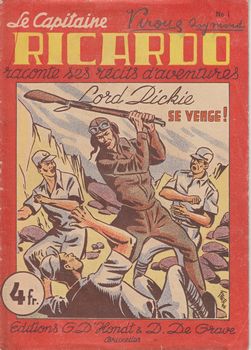 remarques: | titre complet: le capitaine Ricardo raconte ses aventures cette série débute en 1948 la plupart des couvertures sont signées Fred (= Funcken) mais sinon ne porte aucune datation éditions G. D’Hondt &D. De Grave Bruxelles jusqu’au no 131, puis G. Van Loo Dilbeek jusqu’au no 164 et par la suite édition G. Van Loo Anderlecht les fascicules racontent des histoires sur 5 thèmes généraux: aventure, de cape et d’épée, guerre, polar et western + une bande dessinée avec Bill Hickok du no 64 au no 84 (en milieu de fascicule) couverture pleine couleur 16 pages du no 1 au no 7 (Fr. 4.-) couverture pleine couleur 32 pages du no 8 au no 50 (Fr. 5.-) couverture 50% couleur 50% N&B du no 51 au no 63 (Fr. 3.-) couverture N&B 32 pages du no 64 au no 146 (Fr. 5.-) couverture à nouveau pleine couleur 32 pages dès le 147 (Fr. 5.-) dès le no 291 les couvertures sont signés Clem ( ?) les plus belles couvertures apparaissant dès le numéro 147, seuls les 300 premiers nos sont collectionnés ici, les numéros suivants étant vraiment de moindre qualité (n.b. TBE * = TBE mais point 4ème plat découpé, toutefois n’empiète ni sur les illustrations ni sur le texte) numéro 1 ricardo, couverture signée Fred Funcken le prix est de fr belge 4.- jusqu'au numéro 7, puis il passe à 5.- n.b. cette série est difficile à collectionner, les fascicules ne se trouvant que rarement en très bon état, voir bon état+, malgré tout, la collection ici mentionnée consiste principalement de fascicules TBE, toutefois le prix ici est indistinctement fixé à € 2.- par pièce, la qualité littéraire (mise à part les couvertures de Funcken) laissant souvent à désirer, toutefois l'éditeur prône (du moins au début) la qualité éducative de sa publication par exemple au verso du no 100 cette mention: "il est du devoir des parents de veiller à ce que leurs enfants achètent de la bonne lecture, des récits qui ne conviennent pas aux enfants, peuvent avoir une influence néfaste sur leur esprit et leur caractère, une lecture destinée aux enfants, ne peut certainement pas contenir des expressions, ni rendre des scènes, par lesquelles les enfants seraient enclins à analyser des pensées qui ne sont pas de leur âge, une bonne lecture encore, doit toujours contenir une leçon de morale; le ton, les expressions employées, doivent rester dans les limites de la convenance et de la bonne éducation, le récit doit être édifiant, c'est à dire que l'enfant doit être à même tout en se divertissant à la lecture, de s'instruire utilement un bon récit, enfin, doit être écrit dans une langue parfaite, sans pour cela employer des mots trop académiques qui seraient incompréhensibles pour l'enfant (n.b. et dans ricardo on peut dire qu'on est vraiment servi!!) évitez les éditions qui ont pour seul but: gagner le plus d'argent possible" |