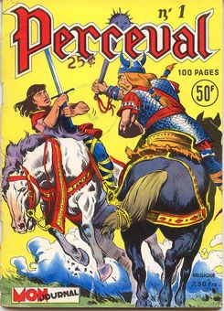 remarques: | édition Mon Journal, série complète, 7 numéros du 9-1959 au 3-1960 100 pages, N&B, au prix de fr 50.-, les aventures de Perceval le Gallois, dessiné par René Bastard et scénario par Jean Ollivier no 1 de septembre 1959 - Perceval le Gallois, chevalier à la cour du roi Arthur, neveu du roi Pellès, aimé par Gauried-qui-jamais-ne-mentit, fille du sénéchal Keu, les démêlé de Perceval avec son adversaire prncipal: Gau d'Ecosse 30 chevaliers de la table ronde dont les principaux: Erec, Galahad, Gauvain, Keu, Lamorak, Lancelot, Mordred, Perceval (vainqueur de la quête du Graal), Sagramor, Tristan et Yvain autres bandes: - le capt'ain Vir-de-Bor, le trésor de Crésus (humour) - Jeff Texas, le frère blanc (western) graphisme par le même dessinateur de Kinowa dans Heroïc aux éditions Sage >>> le texte de Perceval est bien exécuté, genre poème moyen-âgeux mais le graphisme n'est pas très recherché curieusement toutefois cette série est hautement côtée au BDM, les autres bandes sont sans grand intérêt Information 1/ ce Perceval est une adaptation quasi directe du roman de Chrétien de Troyes Il existe plusieurs versions sur sa naissance (le plus souvent mythiques), dans tous les contes, il est de noble naissance et le dernier d'une fratrie de chevaliers, tous morts au combat, son père est soit le roi Pellinor de Listenois, soit un valeureux chevalier anonyme, sa mère dont on ne cite généralement pas le nom, joue un rôle important dans l’histoire, elle emmène vivre son fils dans un manoir isolé au milieu d'une forêt gaste (stérile) pour l'empêcher de devenir chevalier, sa sœur, porteuse du Saint-Graal, est parfois appelée Dandrane, dans les versions où Perceval est le fils de Pellinor, ses frères sont Lamorak, Agloval, Lamorat de Galles et Dornar, après la mort de son père et de ses frères chevaliers, sa mère l'élève donc dans l'isolement de la forêt (ce qui le rend naïf, faisant de lui la figure archétypale de l'idiot des histoires du Graal, d'où son surnom de "Perceval le nice = le naïf") en le laissant jusqu'à l'âge de 15 ans dans l'ignorance de ce qu'est la chevalerie et ce par crainte de le perdre comme elle a perdu son époux et ses deux autres fils, un jour pourtant, tandis qu'il jouait au javelot dans la forêt, le jeune Perceval rencontre cinq chevaliers aux armures si étincelantes qu'il les prend pour des anges, il veut alors devenir lui-même chevalier et se rend à la cour du roi Arthur, après s'être révélé excellent combattant, il est adoubé et invité à se joindre aux chevaliers de la Table ronde Perceval ou le conte du graal, écrit vers 1182, on y retrouve, avec très peu de variations, les différentes péripéties qui mènent ce jeune Gallois élevé au fin fond d’une forêt secrète vers un destin brillant faisant de lui l’un des chevaliers d’Arthur, les plus valeureux et, surtout, le seul à même de trouver le Graal même si certains épisodes sont raccourcis, on y retrouve les grands traits du roman arthurien, Perceval découvre donc au début de l’album l’existence des chevaliers, que sa mère avait tenté de lui cacher pour lui éviter le sort malheureux de son père, puis il multiplie les maladresses, à l’égard d’une jeune femme rencontrée sur son chemin vers le château de Carduel et ensuite à la cour du roi Arthur. mais ce sont aussi ces maladresses qui lui permettent de prendre les armes du chevalier Vermeil, de les revêtir puis, après un court apprentissage chez le seigneur de Goort, de devenir lui-même chevalier. 2/ Mon journal est le nom sous lequel est plus connu l’éditeur de petits formats Aventures et Voyages, jusqu'en 1991 où il prit le nom de Mon journal multimédias pour son catalogue de bande dessinée, il s'agissait de récits complets fondés sur l'aventure, l'exotisme, le fantastique et le sport, on y trouvait des histoires de cow-boys, de pirates, de héros antiques ou médiévaux, les dessins étaient la plupart du temps en noir et blanc avec un trait assez réaliste, le nom des auteurs n'était pas mis en avant, ces fascicules bon marché se sont très bien vendus dans les années 1960 et 1970 historique: c'est Bernadette Ratier qui est à l'origine de cette nouvelle maison d'édition en août 1946, elle commence en lançant Mon journal, un hebdomadaire en grand format qui donnera son nom à la fameuse collection, 86 numéros plus tard (du 8 août 1946 au 22 avril 1948), la société des éditions Aventures et Voyages était créée et l'hebdomadaire cédait sa place à des revues de moyen format (plus communément appelées récits complets) telles que Brik, Yak puis Brik-Yak (dessinés par Jean Cézard), Marco Polo ou Diavolo, le format diminuera un peu avec Dakota ou Biribu avant de passer au format de poche au milieu des années 1950 tandis que la pagination augmentait l’âge d'or les titres se multiplient avec une majorité de bandes étrangères d'origine diverses (Italie, Grande-Bretagne, Espagne, Argentine, etc.), mais aussi quelques auteurs locaux ou quelques bandes que l'éditeur fait réaliser à l'étranger comme Akim, Ivanhoé ou Lancelot, rapidement, les dessinateurs français n'auront plus leur place, mis à part Michel-Paul Giroud comme bouche-trou dans quelques revues; les scénaristes continuant à travailler pour quelques séries phares comme Ivanhoé, Lancelot ou Sunny Sun. au début des années 1980, l'affaire est cédée à Christian Chalmin puis à un groupe d'investisseurs qui, victimes de la désaffection du public, de l'explosion du cours du papier et par manque de compétence, vont faire chuter les ventes. en 1988, la société des éditions Aventures et Voyages, également propriétaire de Mon Journal, lance les magazines pour adolescents Super et Top secrets (premier titre petit format français pour adolescentes avec un plus produit), puis Smash Hits et Big, elle est également à l'origine du mensuel sur les animaux Mag