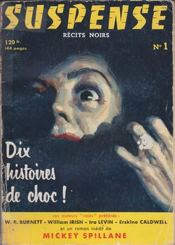 remarques: | numéro 1, avril 1956 récits noirs, édition Opta, édition française de Manhunt, série complète 25 nos 1956-1958, superbes couvertures couleurs jusqu'au no 16, contient chaque env. 10 courts récits de polar, série noire, chaque récit est précédé d'une petite illustration, récits de plus ou moins bonne qualité n.b seuls les 20 premiers numéros sont collectionnés ici contenu du no 1: - douce Sylvia (Sylvia) - la Maison des Heures volées (The Hunted) - 1938 - séance du Matin (Morning Movies) - tous braqués sur moi (1ère Partie) (Everybody's watching me) - 1953 - son premier Coup (First Offense) - 1955 - heureux Ménage (the happy Marriage) - 1955 - panique (Panic) - traitement de Choc (Shock Treatment) - le Magot s'envole (Vanishing Act) - epitaphe (Epitaph) Information Suspense est une revue française de nouvelles de littérature policière, en 1956, Maurice Renault crée cette revue titrée Suspense, récits noirs, le magazine à haute tension, il s'agit de la version française de la revue américaine Manhunt, elle est publiée par les éditions OPTA qui éditent déjà Mystère magazine, elle comprend cent quarante-quatre pages avec dix à douze nouvelles et est vendue cent vingt francs, selon Claude Mesplède, les couvertures sont de superbes illustrations en couleurs, toutefois jugées trop suggestives malgré leur remplacement par des dessins en noir et blanc plus neutres et la censure d'illustrations de l'édition américaine, en 1958, le ministre de l'Intérieur Jean Gilbert-Jules signe un décret qui interdit son affichage, assimilant les publications de ce genre à un danger pour la jeunesse en raison de leur caractère licencieux ou pornographique ou de la place faite au crime dès lors, la revue disparaît des kiosques et des librairies, le vingt-cinquième et dernier numéro paraît en avril 1958 en 1961, Maurice Renault et les éditions OPTA débutent la publication du Alfred Hitchcock magazine qui est couronné de succès,. en 1967, les éditions OPTA tentent de relancer la revue Suspense sous le titre Choc Suspense, mais l'expérience tourne court et ne connaît que quatre numéros |