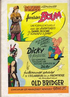 remarques: | série de 57 numéros du 6-1957 au 2-1962 mais seuls les 4 premiers cahiers sont collectionnés ici à titre d'exemplaires représentatifs no 1 du 6.6.1957, mensuel, 68 pages, N&B, prix 15.- fr avec les bandes principales de Daniel Boone, l'homme de la forêt 1/ roman-photo, l'homme à la valise 2/ Daniel Boone, les captifs 3/ Daniel Boone, le siège 4/ bagarre chez les chercheurs d'or 1) les aventures de Dave et Cooskin, trappeurs canadiens n.b. une assez jolie couverture qui sera reprise dans le périodique Intrépide de Del Duca une série qui comporte en plus de Daniel Boone: des romans-photos (adaptations de films d'aventures/western), Texas Rangers, Lash Larue, Blak Noir, Eric le brave, Flambergeac le mousquetaire, etc mais sans grand intérêt |