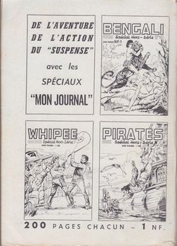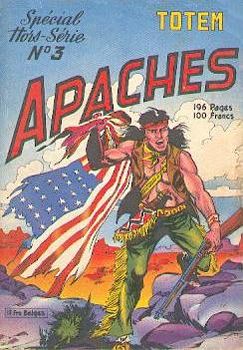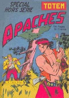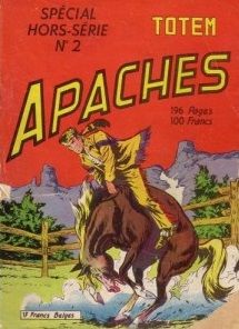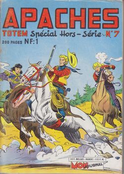 remarques: | éditeur Aventures et Voyages, collection Mon Journal 108 numéros connus de 1957 à 1987, 196 pages, 1 NF avec des aventures diverses relatées au western, le numéro 1 de mai 1957 non numéroté est marqué spécial hors-série Totem, la série complète n'est pas collectionnée ici, seul le no 7 de juin 1960 est présent comme exemplaire représentatif de la série les séries de ce numéro: - Bill Falco, un ranger assez bien dessiné - Soldino en Afrique du Sud (peu intéressant) - captain James et les diablesses de Green Valley (sans intérêt) annexes - apaches no 7 1er et 4ème plat - apaches nos 1, 2 et 3 - apaches dernier no 108 Information Apaches est une revue de l'éditeur Aventures & Voyages, 108 numéros de mai 1957 à janvier 1987, trimestriel de western qui commença comme "Totem spécial hors-série" avant de devenir "Kris spécial hors série" avec une parution trois fois par an pour les vacances scolaires (Pâques, été et Noël) puis de prendre son nom définitif, 196 pages du N°1 au 25, 164 pages du 26 au 68 puis 132 pages jusqu'à la fin, malgré l'absence de série phare, ce titre dura tout de même plus de 30 ans les séries principales furent "Flèche Rouge", "Madok", "Canada Jean" "Les Durs de Durs" et "Arok", mais on y trouve aussi quelques brèves séries britanniques, espagnoles ou italiennes, on retrouve Enzo Chiomenti comme à l'accoutumée pour la plupart des couvertures, mais aussi Tomas Porto, et Miro (sur la fin) et quelques autres, insolites: les premiers recueils étaient panachés avec EN GARDE et WHIPEE! le no 1 de mai 1957 était au format récit complet (13,5 x 18 cm), la série FULGOR de Pedrazza apparait sans titre dans les N°15 et 16, mais aucun doute n'est possible car son héros s'appelle bien ainsi, comme pour TOTEM, Giddap Joe apparait pour un épisode unique (en réédition) dans les derniers numéros, bien que présenté comme une série "Timbale le troubadour" de Cézard, elle ne connaîtra qu'un seul épisode, Mark Trail est paru aussi dans AKIM et OLD BRIDGER de l'éditeur Del Duca ainsi que dans sa propre revue chez l'éditeur Mireille ou encore sous le nom de Mark Been dans la revue CREEK |