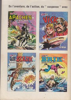 remarques: | une série de 157 numéros qui eut plusieurs titres: parait irrégulièrement 2x par année, puis trimestriel, 192 pages, N&B, prix 100.- fr, puis 1.- NF - d'abord no 1 Dakota Special (Panter Blak) de juillet 1957 >> voir ce numéro sous Dakota jusqu'au no 6 Dakota spécial ((avril 1960), puis - Dorian spécial (4 nos), Marco Dorian spécial no 11 du 8-1961, - Whipee du no 12 (11-1961) au no 26 (4-1966), enfin - Whipii du 27 (7-1966) au no 109 (1-1987), avec les séries de Larry Yuma, Konan Joe, Jim Coronado, Rolf Comanche, capitaine Walter, Scotty, Stormy Joe, Bossy & Cie, Far West, Soleil Rouge, le club des aventuriers, etc seuls sont collectionnés ici le no 1 Panter Blak et le no 64 du 5.10.1975 (surtout pour sa belle couverture) comme exemplaires représentatifs de la série no 64, trimestriel, 164 pages, N&B, prix 2,20 NF - Larry Yuma, l'attaque de la diligence - Soleil rouge, le convoi maudit - le club des aventuriers, le poète qui sauva un roi |
