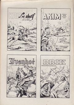 remarques: | Lancelot est une revue de l'éditeur de petit format Aventures & Voyages qui a eu 150 numéros de novembre 1961 à avril 1987, cette revue est née à la suite de la série télévisée britannique le chevalier Lancelot, dont le héros était incarné par William Russell, surfant sur le succès du petit écran, Mon Journal utilisa même durant les premiers numéros des photos-montages des acteurs en guise de couverture, mensuel de 132 pages jusqu'au no 73 avant de passer à trimestriel de 164 pages jusqu'au no 110 où la pagination repassera à 132, les fascicules contenaient de nombreuses séries tels que chevalier Bayard, Casey le cowboy volant, l'agence Flick (par Godard), Rook and Rool (par Giroud), etc la majorité des couvertures étaient signées de la plume de Santo D'Amico le dessinateur de la série titre, il fut parfois relayé par Enzo Chiomenti ou Onofrio Bramante, Lancelot connut aussi des numéros "spéciaux" titrés "Messire" de 21 numéros reprenant des aventures de "Lancelot", mais aussi de Tibor par Hans-Rudi Wäscher, de Bingo ou de La Patrouille Blanche seuls les numéros 1 et 2 sont collectionnés ici à titre d'exemplaires représentatifs de la série no 1 du 28.11.1961, mensuel, N&B, 128 pages, 0,80 NF - Lancelot, la dame du lac, les aventures de Lancelot, fils du roi Ban de Benaic en Bretagne, son père tué par le tyran Claudas, Lancelot est recueilli par la dame du lac - l'agence Flick contre Fantomuch, l'énigme de la banque (humour) - Tibor, le monstre du marais de la mort, Tibor le nouveau Tarzan dans la jungle avec ses singes >> des dessins pas trop recherchés, seul la série Lancelot est de quelque intérêt annexes - couverture 1er et 4ème plat de Lancelot no 1 - couverture de Messire no 1 (Lancelot numéro spécial) Information - Lancelot est aussi le titre du'une série de 4 albums reprenant la même trâme que le Lancelot de Mon Journal, dessinée par Alexe, scénario Jean-Luc Istin aux éditions Soleil |