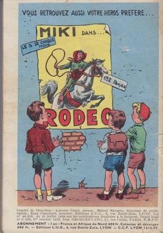 remarques: | format 10x15cm à noter la revue a commencé sa publication au format 10,5x15 cm (100 pages) pour passer au No 95 au classique 13x18 cm mais avec seulement 68 pages avant d'augmenter sa pagination à 132 au No 271, avec Miki comme héros principal les aventures de Miki, le petit ranger paraissent d'abord dans les RC Rodeo no 1 de septembre 1951 (grand format, 18x24 cm) pour continuer au no 43 de Rodeo petit format de mars 1955 et dans Nevada d'octobre 1958 dessinateur: studio EsseGesse >> voir plus bas le second personnage est Trapper John le trappeur, pareil à Blek, il se bat avec ses camarades Alambic et Mike pour l'Indépendance des Etats-Unis dessin: Carlo Cedroni, scénario: Mariani Jean Frisano réalisa de nombreuses couvertures pour ce titre entre 1970 et 1988 Nevada est une revue petit format publiée par les Éditions Lug d'octobre 1958 à septembre 1988 sur 494 numéros, Mensuel essentiellement consacré aux aventures de Miki le ranger dont il réédite les aventures préalablement parues dans Rodéo, Nevada ne fait pas partie des revues les plus collectionnées, mais reste tout de même hautement côté dans le BDM, n.b. seuls les 20 premiers numéros sont collectionnés ici no 1 du 1.10.1958 Nevada avec Miki Ranger, bimensuel, 100 pages, mini-format, N&B, au prix de 40.- fr a) les aventures de Miki le Ranger et ses compagnons Double-Rhum et le docteur Saignée ainsi que Suzy, fille du commandant de fort Coulver (quartier-général des Rangers du Nevada) qui s'est amourachée de Miki le Ranger b) Trapper John, aventure au fort Saint-Georges, et son compagnon le professeur O'Connor, dit Alambic l'histoire se passe en 1775, en Nouvelle-Ecosse, ex-possession française qui est devenue anglaise, de nombreux trappeurs français y vivent encore, mais ils ont à se défendre contre la malhonnêteté des marchands de peaux et la corruption des chefs militaires anglais >> des aventures western, semi-comiques sans grande prétention mais admirablement dessinées Information A) les amateurs de petits formats et notamment de Capt'ain Swing connaissent bien le studio EsseGesse composé d'un trio de dessinateurs italiens: Pietro Sartoris, Dario Guzzon et Giovanni Sinchetto les trois auteurs au style reconnaissable ont imaginé parmi les meilleurs personnages de fumetti: Kinowa (dans "Héroic" en France), Capitan Miki (Miki chez Lug), Blek le roc, Ombrax (tous deux publiés par Lug également) et bien sûr il commandante Mark alias Cap'tain Swing le studio EsseGesse, prononcez S-G-S = initiales du trio d'auteurs, groupe d'auteurs composés de Giovanni Sinchetto (né à Turin le 7 avril 1925), Dario Guzzon (né à Turin le 4.1.1926) et Pietro Sartoris (né à Turin le 15.8.1926), après avoir débuté séparément dans le monde de la BD, Sinchetto en 1947, dessinant Furio Mascherato sur des textes d'Andrea Lavezzolo, et Guzzon l'année suivante, dessinant des histoires sentimentales un peu hautes en couleur, souvent sur des textes de Sartoris, pour "Piccina" (littéralement "la petite"), titre de la maison d'éditions Taurinia, née suite au succès obtenu par "Grand Hôtel" les trois se retrouvent en 1950 à Milan (où Guzzon et Sartoris s'étaient installés après l'arrêt de "Piccina", commençant leur collaboration avec les éditions Alpe) et décident de s'associer en donnant le jour à la EsseGesse, le groupe débute avec Kinowa écrit par Lavezzolo et s'impose en 1951 avec le Capitaine Miki, succès renouvelé 3 ans plus tard avec Le Grand Blek, personnages tous édités par la Dardo et qui dureront longtemps, sauf le premier qui vivra seulement 2 ans, en 1965, s'engageant également dans l'édition, ils donnent vie au bienheureux Alan Mistero (Ombrax) et l'année suivante ils créeront leur troisième personnage à succès avec le Commandant Mark (Cap'tain Swing) qui, à l'aide d'autres auteurs, pousuivra sa carrière jusqu'en 1989, Pietro Sartoris est mort à l'été 1989, Giovanni Sinchetto en janvier 1991 et Dario Guzzon le 3 mai 2000. n.b. séries créées par EsseGesse: Rodeo, Nevada, Kiwi, Blek, Yuma, Capt'ain Swing, Ombrax et Kinowa Information B) Nevada est une série qui débute en octobre 1958, elle reprend tout d’abord les récits de Miki le ranger parus dans Rodéo et son seul intérêt de départ était le format beaucoup plus petit que les formats pocket traditionnels qui permettait de transporter plus facilement les récits du ranger constamment sur soi, en permettant ainsi de se faire une pause lecture à n’importe quel moment de la journée où qu’importe le lieu ceci dit le concept ne suffit pas à accroître l’intérêt d’une réédition, le charme de ces mini-formats agit d’ailleurs plus sur les collectionneurs d’aujourd’hui qu’il n’a agi sur les consommateurs d’autrefois, d’ailleurs, beaucoup de collectionneurs se contentent des 94 premiers numéros qui sont les seuls BD Lug édités dans ce format réduit à l’extrême à l’époque donc, la réédition des récits de Miki n’eut pas le succès espéré par l’éditeur, à un tel point que Miki, qui était souvent présent dans les couvertures des 15 premiers numéros, disparaît quasiment des premiers plats des 80 numéros suivants, laissant la place au héros de la série complémentaire Trappeur John, un clone de Blek, dont le succès rehausse l’intérêt de la collection aux premiers numéros, plus tard il cédera sa fréquence de parution en couverture à Appollon puis Tamar, qui semble-t-il furent énormément appréciés; en dehors de Miki le ranger et Trappeur John, Nevada reprit la suite de nombreuses séries abandonnées dans d’autres périodiques comme: Quentin Doward, JB et Cie, Storm Nelson, Zolt Zarn et tant d’autres, apparaîtront aussi en seconde partie, beaucoup de rééditions comme Johnny Bourask, Madison Bill, Boy Day, Jed Puma etc... ou encore des séries inédites qui seront rééditées plus tard dans d’autres périodiques Lug comme Dave K