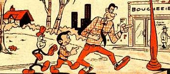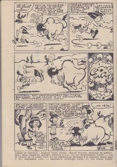 remarques: | Pipo (Cucciolo) et Concombre (Beppe) ont été créés par Rino Anzi en 1940, sur un moule disneyen, Pipo et Concombre sont les héros de cette série humoristique, Pipo est le plus petit des personnages, ensemble ils vivent des aventures extraordinaires où le maître mot est d’aider son prochain, ce qui ne vas pas sans difficultés pour nos deux amis, à noter un troisième personnage important: Elastoc, sorte d’élastique vivant portant un chapeau, et le grand adversaire de Pipo et Concombre: Bombarde séries concernées: Pim Pam Poum, Pipo Spécial, Pipo Mini, Pipo maxi série de 229 numéros de 9-1952 à 11-1961, date à laquelle Pipo fusionne avec Pim Pam Poum, devenant ainsi Pim Pam Poum Pipo en décembre 1961 le dessinateur de Pipo fut d'abord Rino Anzi, puis est repris par Giorgio Rebuffi, Pipo se métamorphose et y gagne en originalité scénario: principalement par Carlo Chendi mensuel, 68 pages, en bichromie (rouge et noir), prix 35.- fr Pipo fut connu pour avoir été le premier petit format à publier des recits humoristiques, ses héros venus tout droit d'Italie dont le fameux "Elastoc" connurent un grand succès malgré l'humour qui peut paraitre aujourd'hui simpliste et complétement décalé, la revue se consacra principalement à publier les aventures du personnage de Pipo accompagné de Concombre, d'Elastoc, de Tip Tap Top neveux de Pipo et parfois de Concombrette, soeur de Concombre et de Fox le shériff-corbeau qui donnera son nom a une revue de western, plus tard en 1954, on retrouvera en complément diverses bandes dessinées, la plupart humoristiques mettant en scène des personnages animaliers, et parfois des bandes dessinées d'aventures comme le tambour du roi, l'aigle de Clermont, chevalier d'Harmental, etc Pipo est resté dans les annales de la bande dessinée périodique et est encore très prisé des collectionneurs aujourd'hui avec le n°1 qui est extrêmement difficile à trouver seuls les 100 premiers numéros de Pipo sont collectionnés ici Pipo no 1 du 20.9.1952, Pipo et l'héritage, Pipo, Concombre et les neveux Tip, Top et Tap apprennent d'un notaire qu'ils ont hérité d'un fabuleux trésor qui se trouve dans une ville de Chine, départ pour la Chine mais le gros Bombarde les poursuive déjà autres séries: - le petit tambour du roi la longue aventure d'Ambroise qui devint tambour du roi, l'histoire se déroule en Italie en 1848 à une époque où tout le nord du pays se trouvait sous la domination autrichienne; Ambroise est lombard mais sous le prétexte que son père soigne les chevaux du baron Torresani, préfet de police italien sous contrôle autrichien, ses amis l'appellent "l'autrichien" mais en fait son père est un fervent patriote qui se fera arrêté puis passé par les armes, ce sera la seule bande réaliste jusqu'au no 41, histoire adaptée de documents historiques, dessinateur Devi (de Vita)? autres séries humoristiques: - Mac-Karon, le policier monté - Séraphin à la mer - les aventures de Caribou, le petit indien >> des aventures humoristiques pas trop recherchées avec un certain charme et qui eurent un grand succès, surtout intéressant de par les titres farfelus et les jolies couvertures ainsi que par les bandes dessinées réalistes genre petit duc dessinées par Devi (De Vita), souvent adaptées de romans d'Alexandre Dumas Information quelques épisodes sont passés à la S.A.G.E. sous le nom de Muche et Toto, l’humour en est parfois surréaliste: les personnages sortent de leurs cases pour s’expliquer avec leur dessinateur un épisode est en 3D (Pipo 28); dans un autre, Pipo et Concombre rencontrent un peuple extraterrestre algébrique dont les habitants s’expriment par formules mathématiques (Pipo 15), de plus, Rebuffi a inventé toute une galerie de personnages secondaires délirants: dans Pipo n° 4 naît Elastoc (Tiramolla), fils du caoutchouc et de la colle, issu d’une expérience de chimie ratée par Concombre (le scénariste de ce récit est Roberto Renzi, le même qu’Akim, qui se défoulait peut-être ici) le cousin Jonas (Giona), qui porte la guigne, apparaît au n° 30, Fantasmak, l’homme aux cent visages, l’ennemi insaisissable (mais existe-t-il vraiment ou est-ce un fantasme?) tente de supplanter Bombarde, le méchant "classique" et, dès le no 41 au no 105, débarque l’insupportable cousine Concombrette (Peppa), flanquée de Koko, un kangourou domestique qui s’exprime par des pancartes; les principaux dessinateurs de Pipo sont Giorgio Rebuffi et Umberto Manfrin (Manberto), la plupart des scénarios sont de Carlo Chendi, |