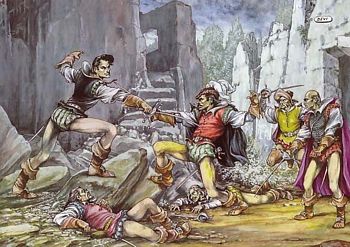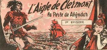 remarques: | numéro 57 du 20.5.1955 - Pipo, explosion à Katapultas - Fox le shériff et Lapinos à la mer - Pipo, Fradiavolo et moustachos nouvelle série réaliste par Devi - l'Aigle de Clermont, part 1 d'après les chroniques du temps à Paris, 1578, dans le palais des Montmorency sous le règne de Henri III >> des bandes humoristiques pas trop recherchées mais qui ont gardé un certain charme et toujours la série réaliste, superbement dessinée par Devi n.b. la bande dessinée de l'Aigle de Clermont est parue en couleur sous forme d'un portfolio chez Fantasmak, Paris paru aussi en N&B chez Horus, 2 volumes Information Louis de Clermont, seigneur de Bussy d’Amboise est surnommé L’aigle de Clermont, il est tombé amoureux fou de Diane de Méridor, l’épouse du comte de Monsoreau, notre héros ne reculera devant rien pour retrouver et conquérir sa belle, tiré du roman la Dame de Monsoreau by Alexandre Dumas que ce soit, accompagné de la douce Diane de Méridor ou de la Reine d'Ahjndar, aux prises avec d'énormes chauves-souris, des panthères affamées ou un lion rugissant, combattant le bandit l'Epervier, l'homme au crochet ou l'infâme Maugiron, en proie aux éléments déchaînés ou sauvant ses compagnons d'une mort certaine, Bussy d'Amboise dit L'Aigle de Clermont nous fait vivre les moments les plus dramatiques, les plus marquants et les plus forts de ses incroyables aventures qui s'échelonnent sur 4 parties et 79 épisodes au total |