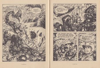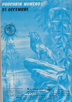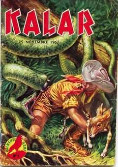 remarques: | série de 232 fascicules de 11-1963 à 5-1986, mensuel, N&B, 64 pages, prix 0,40 NF seuls les 22 premiers numéros sont collectionné ici le premier épisode de Kalar date du 25 novembre 1963 et dès les premiers numéros, le graphisme soigné surprend, au fil des numéros, le dessin devient de plus en plus beau, le dessinateur s'affirme comme un merveilleux peintre animalier, à chaque numéro, on peut trouver de superbes dessins sur pleines pages comme si le dessinateur ne voulait en rien couper et en rien réduire ces merveilleux tableaux, de la façon qu'il dessinait ces paysages et les animaux, on pouvait imaginer qu'il était sur place pour prendre chaque détail tellement le dessin est réaliste, ce dessinateur se nomme Thomas Marco Nadal et a dessiné presque la totalité de la série, un seul homme le remplaça en tant qu'intérim, il se nomme Rafael Mendez no 1 du 25.11.1963 début de Kalar dans le justicier de la jungle, Kalar sauve la vie du petit pygmée Bongo de la tribu des Kiroyos qui deviendra son compagnon attitré >> un scénario plutôt pauvre mais un graphisme sublime Information a) le héros Kalar Jean Calard est le neveu du millionnaire Humbert Calard, il est grand, sportif, intelligent et vient d'achever ses études à Paris, cependant, il est attiré par l'aventure comme son oncle le chercheur de diamants, à la suite de la demande d'un messager, il rejoint son oncle à Tunis et le découvre assassiné avec son harpon, se sachant pris au piège, il décide de fuir en Afrique, seulement son avion s'écrase dans la jungle et il est recueilli par une tribu africaine qui l'appelle Kalar, un mot signifiant Dieu dans leur langue, Kalar apprend l'idiome local et devient le protecteur de la région ainsi qu'un nouveau Tarzan moderne, armé toutefois d'un fusil, et contrairement aux autres tarzanides, Kalar ne se balade pas en pagne, mais avec une tenue de brousse classique, le plus remarquable dans cette bande, c'est le dessin très soigneux de Thomas Marco Nadal qui signe ses planches Marco à noter que Rafael Mendez a aussi dessiné quelques épisodes de la série b) Thomas Marco Nadal il est le 3ème garçon d'une famille de 5 enfants, très tôt, il est passionné par le dessin, mais la mort de son père rend la vie plus difficile et il doit travailler très jeune il dessine tout de même pendant ses rares moments libres et propose ses travaux aux maisons d'éditions de Barcelone sans succès, sous la pression familiale, il passe le concours des postes et se marie, il pense enfin s'en sortir quand un éditeur anglais lui propose du travail, mais Nadal refuse de reprendre les travaux d'un autre artiste et l'aventure coupe court, il se met alors au dessin animalier qui lui plait beaucoup, mais là encore les éditeurs barcelonais ne sont pas intéressés finalement, c'est Impéria, l'éditeur lyonnais de petit format qui vient le chercher car il est à la recherche de nouveaux dessinateurs pour ses fascicules, celui qui signe dorénavant Marco peut enfin donner libre cours à son talent et crée Kalar, ce personnage sera son chef d'œuvre, il lui consacrera plus de vingt ans à dessiner chaque mois une soixantaine de pages |