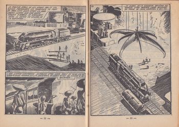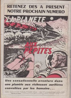 remarques: | série de 30 numéros de 3-1956 à 8-1958, mensuel, 60 pages, N&B au prix de 35.- fr aventures de demain est une revue de bandes dessinées petit format parue chez l'éditeur Châteaudun, format de parution 13x18 cm, une revue publiant essentiellement des histoires de science-fiction d'origine britannique issues principalement de la revue Fleetway "super Detective Library" ainsi que de six histoires de "Tit-bits science fiction", chaque numéro contient un récit complet de 60 pages, la plupart de ces histoires sont dessinées par Ron Turner mais on y trouve aussi le dessinateur anglais Bill Lacey aux numéros 1, 3, 4, 6, 8 et 10 et une seule série: Rick Random que l'on retrouve aux numéros 2, 3, 5, 7, 9, 10, 11, 13 à 17, 27 à 30 les numéros 21 à 26 sont de qualité amoindrie tant pour le dessin que pour le scénario donc de la bonne science fiction classique "à papa", avant-gardiste comme on disait, avec principalement les aventures de Rick Random, détectif de l'espace un style années cinquante comme on n'en fait plus de nos jours, désuette pour certains mais des récits assez bons et sympas à relire la revue a été reprise en italien par Edizioni Mondiali au format 12x17 cm sous le titre "avventure di domani" annexes - couvertures 1er et 4ème plat du numéro 1 - deux pages dessinées par Bill Lacey Information A) Bill Lacey Bill Lacey est un dessinateur britannique né en 1917, il est le père du dessinateur Mike Lacey, durant la seconde guerre mondiale, il sert dans la Royal Air Force avant de devenir technicien pour le ministère de l'air, c'est en 1951 qu'il produit sa première bande intitulée Robin alone dans l'hebdomadaire "Mickey Mouse", on le retrouve ensuite dans "Cowboy comics Library", de 1954 à 1956, il dessine des épisodes de la série de SF: Rick Random pour la revue "Super Detective Library" parus en France dans Aventures de Demain, pour la même revue, il produira Blackshirt en 1957, en 1963, il succède à Gino d'Antonio sur Hawk Hunter and the Iron Horse paru dans "Valiant" (Kid Cheyenne dans Whipii!), en 1963-64, il remplace Eric Bradbury sur Mike Kane gladiator parue dans "Buster" sur des scénarios de Henry Kenneth Bulmer et réédité dans "Valiant" en 1969 sous le titre de the secret champion, en France, la série s'appelle le Gladiateur et elle est parue dans Atémi, en 1965, il dessine Bill Hanley and Rick Slade dans "Lion", puis l'année suivante: the amazing Jack Wonder, de 1966 à 1970, il succède à nouveau à Eric Bradbury sur Mytek the Mighty dans "Valiant" (réédité en 1975 dans "Vulcan") alias King Kong, le robot géant paru dans sa propre revue aux Éditions de l'Occident, on le retrouve plus tard dans la revue "Look and Learn" avec des séries comme the man from yesterday, Jason January, Space Cadet, the Maze Master ou Space Ranger, mais surtout Eagles Over the Western Front, Man who searched for Fear et No. 13 Marvel Street, en 1975, il entre chez "Battle" en dessinant Y for Yellow Squadron avec Ken Mennell au scénario, en 1976, il dessine un épisode de Rat Pack dans "Battle" sur un script de Ken Mennell (cinq de Commando dans Atémi), la même année, il réalisera aussi trois épisodes de Mike Nelson pour cette revue, en 1977, il succède à Felix Carrion sur Double Dynamite dans "Action" (les poulains de Brady dans Atémi) avec Scott Goodall au scénario et il remplace Eric Bradbury le temps d'un épisode sur The Black Crow dans "Battle", en 1978, il illustre un épisode de D-Day Dawson sur un texte d'Alan Hebden pour "Battle" ainsi que le récit complet intitulé Fool's Gold avec Alan Hebden, la même année, il dessine un épisode de Thingumajig dans "Whizzer&Chips" publié en France sous le nom de Marsimonstre dans Yataca, cette année-là, il rejoint DC Thomson pour dessiner Tasker dans la revue "Bullet", en 1981, il illustre the iron fish parue dans la revue "Buddy" de DC Thomson (prince des mers dans Akim (1re série)), mais aussi The Wilde Boys et The Q-Bikes, il dessine également Tom sans peur paru dans Hurrah ou les naufragés de Java paru dans Spécial Kiwi en 1966 ou des épisodes de Robin Hood, Bill Lacey est mort en 2000 B) Ron Turner il est né en 1922, et dès son plus jeune âge il montre un vif intérêt pour la science fiction en lisant des romans classiques comme HG Wells, Edgar Rice Burroughs, Jules Verne, les périodiques de Flash Gordon, ou encore les bandes dessinées d'Alex Raymond, mais également en regardant des films comme Metropolis ou things to come (la vie future) un film de SF avec une vision futuriste assez étonnante du réalisateur William Cameron Menzies et du Romancier HG. Wells, mais ce sont les incroyables couvertures des "pulp magazines" comme Amazing et Astounding stories qui lui donneront le goût pour la science-fiction, Turner va commencer à développer son talent en essayant de copier les illustrations de ces couvertures, souvent spectaculaires artiste anglais, illustrateur et dessinateur de comics, il est l'un des artistes le plus prolifique de sa génération avec un style british années 50/60 facilement identifiable ses livres ont un succès immédiat avec leurs couvertures colorées où il dessine avec talent des astronautes, des fusées et des monstres extraterrestres il commence à être enfin reconnu pour son art et va attirer l'attention d'autres éditeurs, Turner a également eu une grande admiration pour le dessinateur britannique Frank Hampson qui dessine la série DanDare il va donc tenter sa chance à la pige et produire une bande dessinée régulière tout comme son idole, l'occasion se présente à la fin de 1953, il discute avec son éditeur George Newnes, fondateur de l'hebdomadaire britannique Tit-Bits magazine (le spécialiste des romans SF) pour lequel il fournit diverses illustrations, avec la possibilité de produire sa propre série, l'éditeur donne son accord, à la condition qu'elle soit du même format que les romans, c'est ainsi qu'il va c