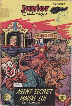 remarques: | série de 66 numéros, depuis le no 17 de mai 1952 au no 82 de septembre 1957, les 16 premiers numéros sont sortis sous le titre Junior (Collection) no 1 du 5.2.1954, devient Junior Cinéma au no 15 avec surtout des romans photos premier no junior espionnage au no 17 de mai 1952 titré "l'iceberg tragique (prof. Jals)" no 42 de mai 1954, agent malgré lui avec un dessin pleine page au centre du fascicule dessin: Brantonne, scénario : L. Mauri >> rien de particulier mais un graphisme assez bon |
