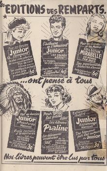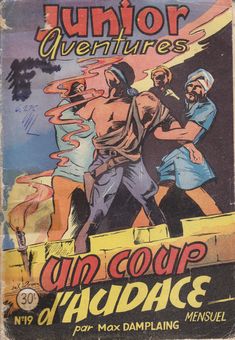 remarques: | Une revue mensuelle de bandes dessinées 66 numéros pour Junior Aventures commençant au no 17 de mai 1952 à septembre 1957. les 16 premiers sont sortis sous le titre Junior (Collection) no 1 du 5.2.1954, devient Junior Cinéma au no 15 avec surtout des romans photos il y eut aussi la série Junior sur les grands héros, une adaptation BD de grands personnages de l'histoire de France tel Charles de Foucault, Mermoz, Boumazel, etc seuls quelques numéros éparses sont collectionnés ici à titre d'exemplaires représentatifs de la série Junior Aventures, no 19, mensuel, 30.- fr dessinateur: Jack De Brown, scénario: Max Damplaing des bandes en N&B avec au centre généralement une pleine page - un coup d'audace, le départ chez Abdullah >> une série avec des aventures sans grand intérêt annexes - couverture junior aventures no 19 - liste des publications Remparts - couverture junior grands héros no 1 éditions Remparts >> voir les 3 scouts no 1 |