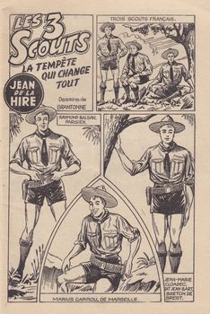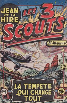 remarques: | les Trois Scouts, d'abord éditions du Carquois, Paris puis éditions des Remparts Lyon 36 pages de format 15x22 cm, bi-mensuel d'après l'oeuvre de Jean de La Hire, des récits complets entièrement dessinés par Brantonne 12 nos de 1953-1954, dernier numéro le gouffre mortel (1954) numéro 1 du 5.10.1953, N&B, 32 pages, prix 30.- fr la tempête qui change tout les aventures des trois scouts: Raymond Balsan de Paris, Marious Carrou de Marseille, et Jean-Marie Cloadec dit Jean Bart, breton de Brest dessin: Brantonne, scénario Jean de La Hire >> assez intéressant, illustrations mêlées à des textes, avec typique pour les éditions Remparts: un dessin pleine page au centre du fascicule Information les éditions des Remparts portaient ce nom car leur siège social était situé au 38 rue des Remparts d'Alnay 69000 Lyon, éditeur de petit format de moyenne importance, on les connaît surtout pour deux bandes dessinées américaines: Mandrake et le Fantôme, mais ils ont aussi publié de nombreux autres titres entre 1950 et 1979. liste des revues: Aigle Noir (6), Andar (6), Arizona (15), Bambolina (34), Banga 1re série (66), Banga 2e série (40), Banko (6), Baraka (4), Billy London (8), Clarinette (89), Flash Gordon (8), Florette (13), Gaucho (6), Go! (24), Hugh! (18), Idaho (35), il était une fois, le journal des enfants (28 ?), Indian Bill (6), Joe Missouri (3), Joker (12), Junior (36), Junior Aventures (66), Junior Espionnage (66), Kill puis OK'Ill (21), King la jungle (24), K.O (5), Lasso (33), le Fantôme (386), les héros de l'aventure (78), les héros du mystère (22), les 3 scouts (12), Mandolino (72), Mandrake (353), Marcellino (42), Mocassin Noir (6), Nagor (5), Olifant (32), Omaha (17), Padaboum (16), Pifalo 1re série (13), Pifalo 2e série (12), Pichou (84), Plume d'Or (15), Prince Valiant, Poncho (13), Red Devil (30), Scoubidou 1re série (62), Scoubidou 2e série (7), spécial Phantom ou spécial le Fantôme (22), spécial Mandrake (22), Tirelire (30), Tonnerre (10) = 1ère revue ayant publié du super-héros en France, Urka! (10), Wapiti (31), Winko (12), Youk (5) |