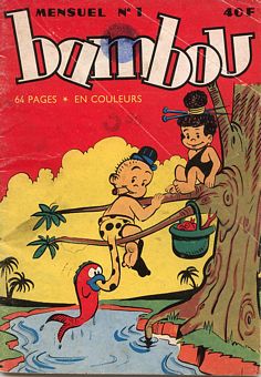 remarques: | Bambou est une revue de l'éditeur Impéria, 127 numéros de 1-1958 à 8-1968, format 13x18 cm, 68 pages alternant couleurs et N&B, prix 40 fr Bambou est une revue petit format composée exclusivement de bandes dessinées humoristiques, surtout connues pour sa fabuleuse parodie de Tarzan avec Tarzazan un baby-tarzan chapeauté que l'on retrouve sur la majorité des couvertures, vu qu'il en est la bande principale Bambou no 1 de janvier 1958 - le grand-père de Tarzazan (humour) - Eclair, le champion invincible (humour) - les 3 perroquets mousquetaires (humour) - Nando et le macaque (humour) - Coucou et l'explorateur disparu (humour) >> de la bd humoristique à 100%, pas très intéressant |