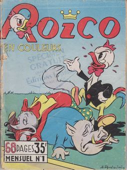 remarques: | série de 285 numéros de 4-1954 à 1-1978 auteurs principaux: dessin Angiolini, scénario Testoni mensuel, bichromie (50% couleur, 50% N&B), 68 pages, prix 35.- fr seul le numéro 1 et quelques autres fascicules sont collectionnés ici à titre d'exemplaires représentatifs de la série Roico no 1 d'avril 1954 - Roico fait des affaires d'or (humour) - Félix, contrôleur des impôts (humour) - l'héritage du bon génie (conte) - Beccos Bill au lasso infaillible (humour) >> des bandes pas vraiment intéressantes |