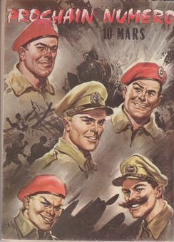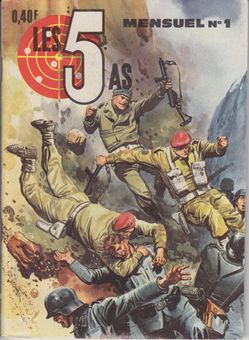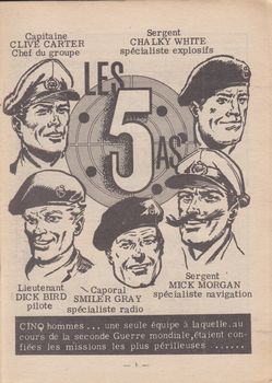remarques: | série de 150 numéros du 10.2.1965 à juin 1986 mensuel, N&B, 66 pages au prix de 0,40 fr les Cinq As forment un commando de choc anglais, engagé dans des missions toujours dangereuses, ce sont tous des combattants courageux, prêts à se sacrifier pour leur patrie ce petit groupe est dirigé par le capitaine Parker, il est composé de: Harrison, Pills, Colman et Pat, ils sont présents sur tous les points chauds de la seconde guerre mondiale, de la campagne d'Afrique à la guerre du Pacifique et pour finir avec le débarquement en Normandie le groupe a une mascotte nommée Fancy, Fancy est un fox terrier des plus malins seul le premier numéro est collectionné ici à titre d'exemplaire représentatif de la série 5 As no 1 du 10.2.1965, - les 5 As, une seule équipe >> un récit de guerre sans grand intérêt mais bien dessiné |