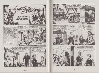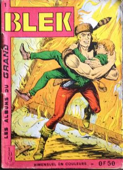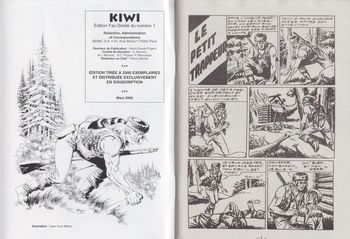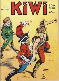 remarques: | une série prolifique à succès qui comprend 582 numéros du 10.9.1955 à décembre 1003 ce qui en fait la pluls longue série connue en petit format, au début mensuel, N&B, 100 pages au prix de 40.- fr les séries principales de Kiwi sont: - Blek le Roc by Essegesse, Kiwi (humour)by Cézard, , le petit trappeur, le Petit Duc by Devi, Zagor et Lone Wolf by Grecchi le numéro 1 en édition originale est côté Euros 200.- ! il eut d'autres séries axées sur Kiwi: 1/ extension de Kiwi: 10 numéros de 8-2004 à 7-2009 2/ Kiwi spécial, 1ère série, 4 nos de 12-1958 à 8-1959 3/ Kiwi spécial, 2ème série, 116 nos de 12-1959 à 8-1988 revue un peu "fourre-tout" ayant contenu des histoires de Blek, mais aussi de Zagor, Trapper John, etc 4/ Kiwi spécial comique, 27 nos de 6-1964 à 12-1970 cette revue n'avait plus rien à voir avec Blek, mettant sur le devant de la scène le héros de Cézard à noter aussi qu'il y eut 140 recueils sur la série Kiwi (1959-2000) et une série avec le titre de Blek le Roc, titre complet: les albums du grand Blek, 519 nos de 7-1963 à 3-1994 ainsi que des albums intégrals contenant le grand Blek, parus aux éditions Soleil (7 albums 1994-1995) Kiwi publia en noir et blanc, les aventures de Blek le roc du trio italien Esse-G-Esse (Pietro Sartoris, Dario Guzzon et Giovanni Sinchetto), mais la revue doit son nom à un personnage de Jean Cézard: un petit oiseau malchanceux que l'on retrouve ensuite dans une version plus luxueuse dans Kiwi Spécial Comique en ce qui concerne les séries secondaires, Lone Wolf de Luigi Grecchi et Fernando Fusco connut une longévité exceptionnelle, mais c'est sans doute Mirko le petit Duc qui restera dans les mémoires grâce à la plume inspirée de Devi, une réédition était d'ailleurs en cours au moment de l'arrêt de la revue. Kiwi fut le petit format ayant la plus longue durée de vie et reste aujourd'hui l'un des plus cotés auprès des collectionneurs, sa suppression en décembre 2003 fut la conséquence de l'arrêt de la licence Bonelli chez Semic, tous les petits formats survivants de l'éditeur furent stoppés le même mois seuls sont collectionnés ici le no 1 en Fac-Similé (mars 2000) et les numéros 45 et 176 à titre d'exemplaires représentatifs de la série Kiwi no 1 Fac-Similé de mars 2000, édition tirée uniquement à 2500 exemplaires avec - Blek le Roc et Roddy le petit trappeur, ** première rencontre de Blek avec Roddy - Marmaduke le lion et King Louie (humour) - Kiwi sur son île déserte (humour) by Cézard ** - Rollo Raton (humour) - le petit Duc, le loup de Turgel (aventure) by Devi, probablement la meilleure série de Kiwi ** ** = les meilleurs récits >> une série qui a connu un grand succès avec Blek le Roc et le Petit Duc annexes - couverture 1er et 4ème plat de Kiwi no 1 - deux planches sur Blek le Roc et le Petit Duc - 1er plat numéro 1 de Blek le Roc Information A/ Blek le Roc Blek, dit Blek le Roc, est un personnage de bande dessinée créé en Italie par le studio EsseGesse composé de Pietro Sartoris (it), Dario Guzzon (it), Giovanni Sinchetto (it) en 1954 pour l'éditeur italien Dardo sous le nom de Il Grande Blek publié a strisce (format à l'italienne) durant 650 fascicules jusqu'en 1967 avant qu'un litige oppose les auteurs à l'éditeur, le trio décide alors d'abandonner le personnage pour en créer un autre similaire chez un concurrent, ce sera Capt'ain Swing (ou Comandante Mark en Italie), personnages le héros éponyme est un trappeur américain d'origine bretonne qui participe à la guerre d'indépendance américaine contre les troupes anglaises (surnommées les "homards rouges"), il est accompagné dans ses aventures par le jeune Roddy et l'érudit professeur Occultis, qui se révèle au fil des aventures aussi gourmand que machiavélique, toujours prêt à bluffer l'ennemi, quant au jeune Roddy, il semble au moins autant influencé par la personnalité d'Occultis que par l'héroïsme de Blek en Italie, Blek le Roc a fait son apparition le 3 octobre 1954, le format est original puisqu'il s'agit d'une revue sous forme de strip (bande) dans laquelle chaque page, de petit format donc, ne contient qu'une seule bande,. chaque numéro hebdomadaire coûte 20 lires et est composé de 32 strips auxquels il faut rajouter les 4 pages de couvertures, les pages 2 et 3 sont initialement constituées de deux romans différents à suivre: la danza del grizzli et l'imbarazzo della scelta Si Roddy apparaît dès la troisième bande du premier numéro, le prof. Occultis ne survient qu'à la seizième bande du sixième numéro, à noter que dans la version originale il est présenté sans ambiguïté comme français, son premier mot est d'ailleurs "Parbleu" et il émaille régulièrement sa conversation de "tonnerre de dieu" les personnages apparaîtront par la suite dans différentes revues avec parfois d'autres dessinateurs que le pool EsseGesse comme pour la série "il grande Blek" (à partir de 1991), soulignons enfin qu'il existe une réédition, a priori complète, des aventures originelles, cette réédition débutée en janvier 1990, toujours chez Dardo, s'est étalée sur 52 numéros mensuels, chaque livraison étant composée de plus de 100 pages de BD en France, les éditions lyonnaises Lug publient l'intégralité des aventures de Blek un an à peine après sa sortie en Italie, la série est d'abord éditée en noir et blanc dans la revue de petit format Kiwi, puis rééditée en couleur dès 1963 dans une revue bimensuelle dédiée à son nom: Blek, de nombreuses couvertures furent réalisées par Jean Frisano, quand les histoires originales furent épuisées, d'autres histoires furent créées avec notamment Carlo Cedroni ou Nicola Del Principe, mais aussi en France par Jean-Yves Mitton, André Amouriq ou Ciro Tota, en 1988, des dessinateurs yougoslaves reprirent aussi le personnage, on a pu lire ces histoires dans les derniers numéros de Kiwi. B/ revue Blek le R
