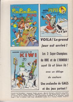 remarques: | no 176 du 10.12.1969 - Blek le Roc, le petit trappeur et le professeur Occultis dans "mission spéciale" - les anges de l'enfer, la dernière porte (aventure) >> seule la série de Blek le Roc est de quelque intérêt annexes - no 176, 1er et 4ème plat - couverture du dernier numéro de Kiwi no 582 de décembre 2003 "le fantôme de Boston" |