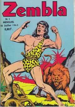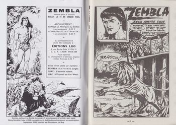 remarques: | une série prolifique à succès (on ne sait pas bien pourquoi car la série Zembla n'a rien de vraiment intéressant) - 479 numéros de 7-1963 à 12-1994 mensuel, N&B, 130 pages au prix de 0,80 fr - 175 numéros Zembla spécial de 6-1964 à 11-2003 à noter que le no 1 de l'édition originale est côté 60.- Euros les récits contenus dans la série Zembla: Zembla, Fury, Mac, Guillaume Tell, Tom Billiby, Rakar, Gun Gallon, Dick Demon, Rory Bang, Bill & Barry Marino, Bozart, Afrikanders, Tocard Gang, etc Zembla est une revue petit format des éditions Lug, cette revue porte le nom du héros de la série principale qu'elle contient, elle débute en juillet 1963, en même temps que la revue Blek, dans les premiers numéros du périodique, on trouvera en plus de Zembla les récits de Fury, ainsi que Mac qui contribuent positivement au succès de la revue, on notera que ces trois récits sont des créations Lug et mettent tous en scène un trio de héros, plus tard, la revue contiendra Gun Gallon, une série fantastique, ainsi que Rakar, tous deux créées par Marcel Navarro, et qui comptent parmi les grands chefs d’œuvre de l’éditeur Zembla no 1 Fac-Similé de septembre 2000 uniquement tiré à 1500 exemplaires avec - Zembla, seul contre tous Zembla, le tarzanide, roi des animaux, aventures semi-comiques - Fury le parachutiste lors de la guerre de Corée, quelque similitude avec les chevaliers du ciel - Mac Kenzie l'écossais et ses deux amis, Kokko et Updike = genre de Laurel et Hardy 1860, lutte entre les colons et les indiens Creek >> des bandes semi-comiques vraiment sans grand intérêt annexes - Zembla, 1er et 4ème plat du no 1 - une planche de Zembla - une planche de Fury - couverture no 479 du 5.12.1994 , dernier numéro de la série Information Zembla, genre de Tarzan, alias l'homme-lion pouvoirs: agilité, rapidité, force surhumaine, technique de combat corps à corps, parle et comprend les animaux personnage créé par Augusto Pedrazza et Marcel Navarro première apparition: Spécial Kiwi no 15 (juin 1963) Zembla est un tarzanide qui passe son temps à combattre et vaincre divers malfaiteurs pour faire triomphe le bien aussi bien dans la jungle qu'en ville, créé par le cofondateur des éditions Lug Marcel Navarro pour concurrencer Akim des éditions Aventures et Voyages, elle a été animée par des auteurs italiens ou français, les origines c'est l'artiste Augusto Pedrazza qui donna vie sur le papier à ce Tarzanide sous l'impulsion de Marcel Navarro, créé pour rivaliser avec le personnage italien Akim, créé lui aussi par Pedrazza, au bout de quelques épisodes, Franco Oneta prend la relève car Pedrazza ne peut pas assurer le dessin d'Akim et Zembla simultanément, Zembla devient rapidement l'un des plus gros succès de Lug jusque dans les années 80 où la montée en puissance des publications Marvel condamne le personnage aux rééditions les personnages dans la version originale, les amis de Zembla sont: - Rasmus, un prestidigitateur en habit de frac, coiffé d'un haut-de-forme, parodie de Mandrake; il loupe tous ses tours de passe-passe, parfois, il porte une cape rouge d'un côté et noire de l'autre; malgré cette partie en rouge, il lui arrive souvent d'écouter une conversation derrière un buisson sans se faire remarquer, l'une de ses répliques préférées est "purée de nous autres" et il s'exclame souvent "funérailles" - Yéyé, un enfant noir avec un casque marqué MP (signifiant Military Police); son tic-tac (un réveille-matin accroché en collier) est une arme redoutable, mais il peut arriver qu'il sonne à un moment inadéquat, l'un de ses jurons préférés est "par saint Frusquin" - Pétoulet (un kangourou), grand amateur de fruits; bien qu'il ne mange pas de viande, il aide Zembla à chasser pour nourrir leur petite troupe - Satanas (un chat sauvage, peut-être un serval), il est toujours affamé, rêvant de chasser de "grassouillettes gazelles", il se met fréquemment en colère contre Rasmus, Pétoulet ou Yéyé, mais il est prêt à donner sa vie pour eux sans l'ombre d'une hésitation, l'un de ses jurons préférés est "par Astaroth" - Bwana, un lion placide faisant figure de sage, "bwana" est un terme swahili signifiant maître ou Monsieur; il est probable que les auteurs de Zembla l'ont pris en se basant sur les livres de Edgar Rice Burroughs relatant les aventures de Tarzan, dans la série des années 1970, lorsqu'on le voit en couleur, sa crinière est représentée de la même couleur que celle d'un lion ordinaire, par contre, dans le texte de cette bande dessinée, il est indiqué que sa crinière est blanche, dans la nouvelle série, il est représenté avec une crinière blanche - Takuba, la reine de la tribu des Gombars; elle se met souvent en colère contre Rasmus et elle compte épouser Zembla qui est tout sauf d'accord, le nom de Takuba (Takuba) correspond à une épée du Sahel par rapport aux autres tarzanides, Zembla se différencie par une espèce de bretelle sur son short: la bretelle et le short sont en un seul morceau découpé dans la peau d'un léopard, tué en combat singulier. le nouveau Zembla la série originale fut publiée sans interruption jusqu'aux années 1980, c'est en 2000 que Semic le réintroduit pour de nouvelles aventures, apparaissent alors de nouveaux personnages, des ennemis récurrents et le héros y gagne même une identité classique, initié Par Thierry Mornet et Jean-Marc Lofficier, c'est Chris Malgrain qui réalisera le premier nouvel épisode, ce retour donne à la série un côté "comics" très marqué, Zembla s'appelle dès lors Pierre Marais, son surnom signifiant "l'homme-lion" il a la double nationalité française et du Karunda (pays imaginaire situé en Afrique équatorienne), fils de Paul Marais et d'Ula, son grand-père maternel s'appelle Naghar ses nouveaux amis sont Joanni Bourask, Mozam, Antales et Frank Universal et sont tous issus du catalogue de personnages Lug (