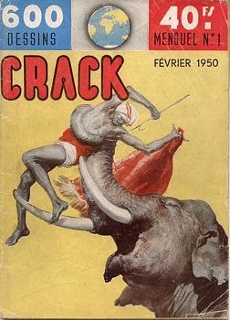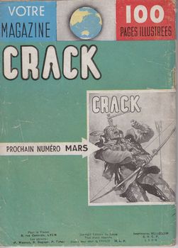 remarques: | série Crack des éditions Imperia, seulement 7 nos connus, le numéro 8 avait été annoncé mais n'a jamais paru, du no 1 au no 7 (février 1950 à septembre 1950), avec Superboy, ce fut un des premiers petits formats publiés, bien côté au BDM, pas mentionné à la Bedetheque, ce petit format était publié en un genre trichromie (bleu-vert-rouge) mais ne présentait pas des récits de grande qualité, nombreuses bandes dessinées mais d'auteurs inconnus, sauf une bande humoristique par Jacovitti, son partenaire, le PF Superboy, était uniquement en N&B mais de meilleure qualité no 1 février 1950, mensuel, 96 pages, prix 40.- fr - prisonnier du St-Anne (histoire) ** - terre de personne, 1ère partie (guerre) - bolas perdidas (western) - l'onde mystérieuse (aventure) ** les meilleurs récits Information Impéria était un éditeur français de bande dessinée, de 1951 à 1986, c'est l'un des plus importants éditeurs de petit format, en 1946, Robert Bagage fonde les éditions du Siècle au 8 rue de Brest à Lyon après avoir entamé sa carrière comme dessinateur dans des revues comme Jumbo en utilisant le pseudonyme de Robba, l'époque est aux récits complets et le nouvel éditeur n'en lance pas moins de 6: Tom'X, Radar, Targa, Garry, Youpi et Captain Horn en octobre 1949, ils lancent leur premier petit format: Super Boy qui fut historiquement le second après 34 (et 34 caméra) de Vaillant n.b. revue de bande dessinée parue aux éditions Vaillant: 122 numéros d’avril 1949 à janvier 1955, 2 numéros spéciaux et 19 recueils, au début la revue s’appelait 34, puis 34 Camera au no 77 et Camera au no 111 ce petit format fut considéré comme le premier petit format français,. récits d’aventures, de sport et de science-fiction (la série du même nom, dessinée par Félix Molinari n'est lancée qu'en 1958), vint alors le temps de ces fascicules de poche avec la création d'autres revues, tels que: Crack, Prairie, Buck John par Bob Leguay, Roico, Kit Carson par Bob Leguay, Minouche qui vise un public féminin, Garry est le seul "récit complet" à être ensuite passé en PF (au no 190), en 1951, les éditions du Siècle deviennent Impéria, si Robert Bagage, Félix Molinari et quelques autres travaillent beaucoup, la majorité des bandes est importée, principalement d'Angleterre avec des westerns ou des récits de guerre (comme Rangers) car Impéria s'est immédiatement positionné comme un éditeur plus adulte lorsque le matériel d'origine est épuisé, des dessinateurs (souvent) espagnols sont embauchés pour poursuivre les séries, dans les années 1970, alors que des concurrents comme Lug et Arédit se sont mis à publier des revues en plus grand format et en couleurs, Impéria reste attaché au format de poche et au noir et blanc, sur la fin, l'éditeur ne propose plus que des rééditions, ce qui accélère sans doute le déclin des ventes jusqu'au n°14 de Crampons, la dernière revue encore active il est à noter l'exceptionnelle longévité des revues de l'éditeur avec des titres comme Buck John (613 numéros), Kit Carson (552), Tex Tone (526), Super Boy (402), etc |