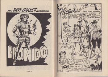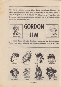 remarques: | numéro 26 du 1.10.1956 - Texas Bill, trahison - Gordon Jim, début d'une nouvelle série qui fait l'objet de la couverture Ecosse 1775, deux puissantes familles: les Argyll, en territoire écossais, l'autre les Sutherland, en terre anglaise se livrent une lutte sans merci accusé de meurtre, Gordon Jim, fils du duc d'Argyll, doit s'exiler en Nouvelle Angleterre et se range du côté des rebelles américains, d'abord habillé en hussard, il prendra l'habit de trappeur, il est accompagné du géant écossais, Mac Hardy et d'un autre écossais pas très malin, Lèchefrite, neveu de Mac Hardy, en luttant avec les rebelles, Gordon Jim s'attirera l'amitié de l'officier français Lafayette mais Gordon Jim devra combattre de féroces ennemis, tels sir Drake, l'espion anglais et les chefs indiens Lone Wolf et Powatan plus tard, il fera aussi connaissance avec un deuxième personnage loufoque: le curieux petit bonhomme Eloi Mac Ivy dit truffard l'irlandais et son putois Eulalie cette série deviendra une série phare de Fox mais ne durera que 8 numéros (jusqu'au no 32), elle présente quelque similitude avec la série Blek le Roc - Bébert (humour) - le vieux tour (polar), RC assez bien imaginé - Lemmy Din, l'infâme condamnation (western réaliste), une nouvelle bande qui ne réussit toutefois pas à convaincre, malgré le trio assez original de Lemmy Din, le vieux Tappo et le pasteur Don Carotte >> début de nouvelles séries dans Fox, mais seules Texas Bill et Gordon Jim seront de quelque intérêt (principalement Gordon Jim bien dessinée) annexes - couverture fox sur Gordon Jim - bande-annonce pour Gordon Jim - bandes-annonces pour Hondo et Kiwi |