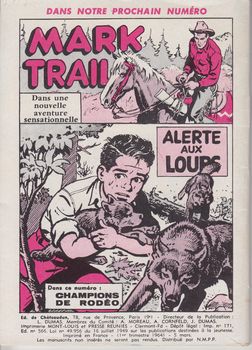 remarques: | série Mark Trail aux éditions Châteaudun, 12 numéros connus de mars 1964 à juin 1965, contient principalement les aventures de Mark Trail, trappeur animalier, au Canada, bimestriel au début, puis mensuel, 64 pages, N&B, prix -.50 fr, no 12 dernier fascicule, les aventures de Mark Trail continuent dans "le journal de Nano et Nanette", dessinateur Rod Ruth, (1955 à 1966), journal créé par Marijac une série plutôt intéressante avec de la documentation sur les animaux et principalement sur de l'aviation no 1, perdus sur la banquise by Edward Dodd ** + Jerry Jengo, sheriff de 1ère classe (humour) + film "la conquête de l'Ouest" ** les meilleurs récits Information les éditions de Chateaudun furent la création de Marijac, l'un des grands hommes de la bd populaires en France, petit éditeur de petit format, Marijac réussit tout de même à propulser quelques-unes de ces revues sur le devant de la scène, on pense bien sûr à Coq hardi et à Frimousse, plus spécialisé sur les revues pour jeunes filles, il sut imposer une grande qualité en écrivant lui-même ses scénarios et en confiant les dessins à des dessinateurs de talent comme Dut, Christian Mathelot ou Claude Marin, créé en 1956, l'éditeur cessa son activité en 1971, certaines de ses bandes furent reprises par les Éditions Jeunesse et Vacances, les principales revues: Aventures de Demain (30), Bout d'chou (25), Coq hardi (12), Frimousse (242), Frimoussette (136), Mark Trail (12), journal de Nano et Nanette (468), Mes Histoires Illustrées Préférées (16), Princesse (179), |