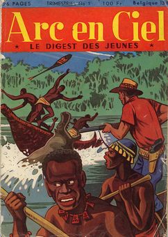 remarques: | Arc en ciel est une revue des éditions de l'Occident sous-titrée "le digest des jeunes" 29 numéros d'août 1956 à août 1960, format 12x18 cm, N&B et couleur, mais numérotation incertaine jusqu'au n°28 trimestriel de 196 pages, passe bimestriel au n°5 et mensuel au n°9 et à 164 pages au numéro 11, 196 pages au prix de 100.- fr, couvertures principalement de Pierre Dupuis >> seuls les 11 premiers numéros sont collectionnés ici à titre d'exemplaires représentatifs de la série Arc en Ciel numéro 1 du 1.8.1956 - Tommy Tim, le trappeur dit le fils de l'Ouest avec son frère rouge Oogli, l'histoire commence au moment où les indiens et les visages pâles se livraient une guerre sans merci dans tout l'Ouest - Maxime Ohm (humour futuriste) by Radenen - le petit chinois, un tour de magie (humour) - les dragons de Barbevieille (humour) - trop gourmande, madame Renard (humour) - Jean la misère, quelque peu dérivé du roman "sans famille" - poursuite en enfer, une aventure de Gun Loo (genre Anton Marcus) et son fidèle boy Yamatuc - chasse aux timbres-postes (le vol de vieux timbres) - le dévoyé (histoire), genre d'Artagnan, les aventures du gentilhomme Henri de Forges au XVIIème siècle >> une série pas trop mal conçue, comme le titre l'indique, on y voit des récits de toutes les couleurs avec une bonne qualité d'impression 50% couleur 50% N&B, des histoires semblables à celles publiées dans les fascicules Teddy, Hoppy, Tam Tam, Zappy et Zorro Information les éditions de l’Occident étaient domiciliées au 99 avenue de la Brabançonne à Bruxelles, faisait partie du groupe Chapelle, l’administrateur délégué était Louis Musin, maison d’éditions assez mineure dans les bandes dessinées petits formats, séries éditées: - Astrella - Cap'tain Popeye - Dennis La Malice Poche - Diabolik - el Desperado - el Diablo - Espace - Kébir - Kwai les baroudeurs - l'Invincible - M.15 James Eros - Main D'Acier - Nico - Odine - Plume Rouge - Prosper Poche - Sachem Blanc - Tartine |