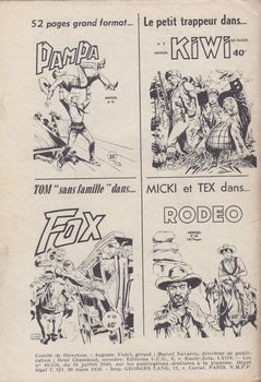 remarques: | numéro 13 du 20.3.1956 - Frisco Smith et petit corbeau, le cavalier noir un récit très similaire à Tex Willer par Galleppini+Bonelli - remous sous l'océan (science-fiction) >> surtout intéressant de par l'épisode de Frisco Smith |