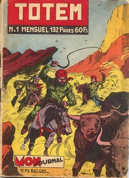 remarques: | il y eut deux séries pour totem: - 1ère série, 49 numéros d'avril 1956 à mai 1960, mensuel, N&B, 132 pages au prix de 60.- fr - 2ème série, 66 numéros d'août 1970 à novembre 1986 seuls les deux premiers numéros de la première série sont collectionnés ici à titre d'exemplaires représentatifs, Totem no 1 du 1.4.1956 - la patrouille du ciel (science-fiction) an 2000 sous un gouvernement mondial unique mais de la science-fiction à la Buck Rogers - Kiriki (humour) - le Kid de Chicago (aventure) - drame dans la prairie (western) >> série de qualité moyenne |