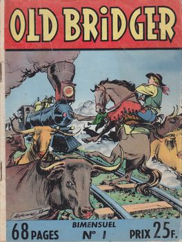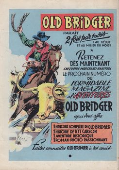 remarques: | série de 63 numéros de 11-1956 à 2-1962, bimensuel, N&B, 68 pages au prix de 25.- fr la série principale Old Bridger est dessiné par Bob Dan, le dessinateur de Bill Tornade dans Audax (Artima), il y aura aussi une 2ème série intitulée Old Bridger et Creek, c'est la suite de Old Bridger au no 64, 13 nos de 3-1962 à 3-1963 >> seuls les deux premiers numéros sont collectionnés ici à titre d'exemplaires représentatifs de la série numéro 1 du 15.11.1956 - Old Bridger, le cheval de feu by Bob Dan - Kit Carson et l'or des sioux - les chevaliers du roi (histoire sous le règne de Cromwell) - le gentilhomme proscrit (roman-photo) >> seule l'épisode de Old Bridger est digne d'intérêt Information Old Bridger (scénarisé et dessiné par Bob Dan) C'est un trappeur, éclaireur de l'armée, en tout cas un justicier qui combat ou fait la paix avec les indiens, résoud les tensions entre les colons blancs et les tribus et ne déteste pas l'aventure risquée. dans les premiers numéros, Old Bridger a un visage assez marqué presque vieillissant, il rajeunira par la suite, toujours vétu de la célèbre veste en daim à franges et coiffé parfois d'un bonnet raton-laveur (comme Davy Crockett) ou d'un classique Stetson |