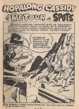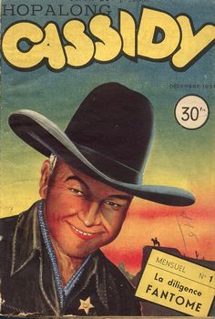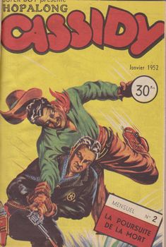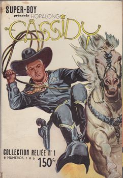 remarques: | série de 115 numéros de 12-1951 à 8-1957, c'est l'équivalent du fascicule Prairie, mais en moins bonne qualité (tant pour le dessin que pour le scénario) mensuel, 32 pages, 50% couleur 50% N&B, au prix de 25.- fr, Hopalong Cassidy a aussi été dessiné en partie par Gene Colin la série est continuée en petit format avec 176 numéros du no 116 (8-1957) au no 291 (12-1964) >> seuls les six premiers numéros de la 1ère série sont collectionnés ici à titre d'exemplaires représentatifs reliure no 1 contenant les 6 premiers numéros d'Hopalong Cassidy - numéro 1, décembre 1951, l'attrait de l'or, Mesquite l'athlète, le train d'or dévalisé, la diligence fantôme - numéro 2, janvier 1952, la poursuite de la mort, terreur à la fête foraine - numéro 3, février 1952, les hors-la-loi du Far West, les 3 trigger Clinton, le triplé trouble; le dernier des Sioux, les assassins de l'arsenal - numéro 4, mars 1952, le retour des morts, minuit dernier délai, le cocher fantôme, l'étrange mission - numéro 5, avril 1952, alerte au sud, la fille du forgeron, l'accusé, de l'argent chez les morts - numéro 6, mai 1952, la justice dans l'ouest, la mésaventure de Mesquite. des mules pour le Mexique, les voleurs de terres n.b. les titres mentionnés sur la couverture ne correspondent pas toujours aux titres mentionnés à l'intérieur du fascicule >> des aventures de qualité moyenne mais qui ne valent vraiment pas celles de Flèche d'or dans Prairie annexes - couverture reliure no 1 cassidy - couvertures 1 et 2 des fascicules Cassidy (1951) - planche avec Hopalong Cassidy Information Hopalong Cassidy est un cow-boy de fiction créé en 1904 par Clarence E. Mulford, ce personnage a inspiré des romans, des bandes dessinées, des séries télévisées et apparaît dans des dizaines de films entre les années 1930 et 1950, dans ceux-ci, il est incarné par William Boyd, l'acteur apparait également dans "sous le plus grand chapiteau du monde" (film de 1952 de Cecil B. DeMille), où il est à nouveau présenté en tant que Hopalong Cassidy |