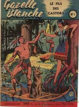remarques: | Gazelle blanche est une revue hebdomadaire de l'éditeur Sage, 52 numéros de juin 1949 à juin 1950, hebdomadaire de type récit complet au format 15 x 20,5 cm, 12 pages, N&B, au prix de 12.- fr la série continue dans Ranch Magazine en 1950 >> seul le numéro 1 est collectionné ici à titre d'exemplaire représentatif de la série Information série italienne appelée Aquila bianca par Ingam alias Enzo Duflocq Magni puis Carlo Savi, Pini Segna et Marculeta durant 28 fascicules en 1949 pour l'éditeur italien Arc série reprise sous le titre Kerwo dans Heroic (grand format) (n°150-172) en 1956-57 puis dans Le Petit Shérif petit format nos 1-20 en 1957-58. deux tribus indiennes du Canada trouvent la paix grâce à une enfant blanche tombée du ciel, qui, devenue une belle jeune fille devient la compagne d’Ervo,fils du chef de la tribu des Castors, accompagnés dans leurs aventures par le trappeur Rugby, sa nièce Minie et le chien-loup Lip |