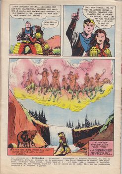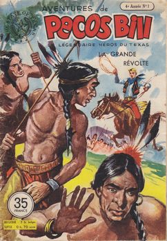remarques: | les séries des aventures de Pecos Bill, publiées par P.E.I. = Périodiques et Editions Illustrés (groupe Sagedition) sont diversement constituées, les séries sont groupées en 8 années - 1ère série, 1-3ème année, 52 numéros de 11-1950 à 12-1952, principalement pour le dessin: Rafaele Paparella et G. Martina pour le scénario - 2ème série, 4ème année, 24 numéros de 1-1953 à 12-1953 - 3ème série, 5ème année, 24 numéros de 1-1954 à 12-1954 - 4ème série, 6ème année, 24 numéros de 1-1955 à 12-1955 - 5ème série, 7ème année, 24 numéros de 1-1956 à 12-1956 - 6ème série, 8ème année, 18 numéros de 1-1957 à 9-1957 la principale bande en est Pecos Bill par de nombreux auteurs italiens dont Paparella, de Vita, Battaglia et Cimpelin épisodes complets en un ou plusieurs numéros de ce légendaire héros du Texas qui remporta un succès énorme en France et en Italie, prépublié dans Aventures d'après-guerre, Pecos Bill récits complets est d'ailleurs la suite de cet hebdomadaire >> seuls les 10 premiers numéros de la 4ème année sont collectionnés ici à titre d'exemplaires représentatifs de la série Pecos Bill Pecos Bill, no 1 4ème année du 1.1.1953 bi-mensuel, 50% couleur, 50% N&B, 32 pages au prix de 35.- fr la grande révolte avec Pecos Bill accompagné de sa compagne Jane Calamity + biographie de Sitting Bull part 1 by Joe Hamman, grand chef et sachem des Sioux, sous le titre "les grands chefs indiens" >> des récits sans grande prétention mais assez bien conçus, les peaux-rouges sont particulièrement bien dessinés probablement par le même auteur de Kinowa dans "Heroïc" (Sagedition) Information 1/ Pecos Bill est une série de bande dessinée de western créée en Italie en 1949 dans Albi d'Oro par le scénariste Guido Martina et le dessinateur Pier Luigi De Vita, elle met en scène Pecos Bill, héros légendaire du Far West, et ses aventures contre divers brigands, hors-la-loi et indiens, Raffaele Paparella, Dino Battaglia, Gino D'Antonio, Leone Cimpellin, Armando Monasterolo, Victor de la Fuente figurent parmi ses différents dessinateurs. la série a été traduite en français et publiée en France dès 1950 par la SAGE dans divers petits formats, elle a été ultérieurement diffusée par Aventures et Voyages et Jeunesse et Vacances (dans un petit format homonyme = avec le même orthographe) Pecos Bill est un cow-boy américain, apocryphe immortalisé dans de nombreuses légendes et histoires du far-west américain de la période de l'expansion vers l'Ouest du territoire américain les premiers récits évoquant ce personnage ont été publiés en 1917 par Edward O'Reilly pour The Century Magazine, et réimprimés en 1923 dans le livre Saga of Pecos Bill, O'Reilly a déclaré que ces récits faisaient partie d'une tradition orale des contes racontés par des cow-boys au cours de l'expansion vers l'Ouest vers le sud-ouest du Texas, le Nouveau Mexique, le sud de la Californie et l'Arizona le folkloriste américain Richard M. Dorson constate pourtant que O'Reilly a inventé ces histoires faisant d'elles des "fakelore", de même, les autres écrivains qui reprirent ces histoires ne firent que reprendre les contes d'O'Reilly ou ajoutèrent des aventures de leur propre invention, on doit un des meilleurs recueil connues sur Pecos Bill à James Cloyd Bowman; Pecos Bill: the greatest cowboy of all time (1937), qui a remporté la médaille Newbery en 1938, Edward "Tex" O'Reilly sera co-auteur d'une bande dessinée avec le dessinateur Jack A. Warren, également connu sous le nom Alonzo Vincent Warren, entre 1929 et 1938, lorsque O'Reilly meurt en 1938, Warren commence une bande intitulée Pecos Pete, une bande dessinée du même nom est publiée en Italie à partir de 1949 et devient rapidement une des séries de western les plus durables de la péninsule Pecos Bill apparait au cinéma dans le film d'animation Disney de 1948 Mélodie Cocktail, en 1995, il sera interprété par Patrick Swayze dans le film "les légendes de l'Ouest" "Pecos Bill" était aussi le surnom, pendant la guerre de Sécession, du général William Rufus Shafter, bien qu'il soit d'une époque antérieure à la légende créée par O'Reilly selon la légende, Pecos Bill est né au Texas dans les années 1830, Pecos Bill, benjamin d'une famille de 18 enfants, se déplaçait avec sa famille dans un wagon couvert quand il tomba à leur insu près de la rivière Pecos (qui lui donnera son surnom), il est alors recueilli et élevé par une meute de coyotes, des années plus tard, il est retrouvé par son vrai frère, qui réussit à le convaincre qu'il n'est pas un coyote, plusieurs légendes et récits racontent les exploits réalisé par ce héros de l'Ouest, on dit par exemple qu'il utilise un serpent à sonnettes nommé Shake comme lasso et un autre serpent comme petit fouet, son cheval, Widow-Maker (aussi appelé Lightning), a été ainsi nommé parce qu'aucun autre homme ne pouvait le monter et survivre, en France, ce cheval est un mustang appelé Cyclone, il est également dit dans la légende que Pecos montait parfois un puma au lieu d'un cheval tout comme Paul Bunyan et John Henry, Pecos Bill est décrit comme un géant il est dit que Pecos Bill est mort de rire, dans l'histoire de "the death of Pecos Bill", Pecos Bill est dans un bar quand un soi-disant garçon de la ville arrive avec des chaussures et un costume en peau d'alligator, Pecos Bill trouve cela amusant et se met à rire jusqu'à la mort! |