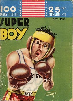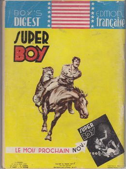 remarques: | Super Boy est une revue de petit format de l'éditeur Impéria, comptant 402 numéros d'octobre 1949 à mai 1986, il y a eu deux périodes distinctes: la première où la revue propose divers récits en BD accompagnés de rédactionnel pour la jeunesse, qui durera jusqu'au numéro 111 (novembre 1958), et la seconde où la revue abritera les exploits du héros américain Super Boy, dessiné par Félix Molinari, jusqu'à la fin de la parution (novembre 1986), Super Boy est chronologiquement le second petit format après 34 caméra de Vaillant couvertures de Robert Bagage, puis Kurt Caesar et Rino Ferrari dans la première version, et Félix Molinari dans la seconde seuls les 23 premiers numéros + quelques nos spéciaux sont collectionnés ici à titre d'exemplaires représentatifs de la série no 1, octobre 1949, éditions Imperia, 100 pages illustrées, mensuel, N&B, au prix de 25.- fr mensuel - Nylon Carter, le typhon (espionnage) - le désert blanc (aventure) RC ** - Jimmy et Johnny (aventure) - les crack du "River Plata" (sport) - les babouches d'Allah (humour) by Jacovitti ** les meilleurs récits >>> mais à noter que les premiers fascicules Super Boy étaient de 1949 à 1951 d'une qualité d'impression très médiocre malgré quelques bons récits de bande dessinée Information a) les éditions Imperia Impéria était un éditeur français de bande dessinée, de 1951 à 1986, c'est l'un des plus importants éditeurs de petit format, en 1946, Robert Bagage fonde les éditions du Siècle au 8 rue de Brest à Lyon après avoir entamé sa carrière comme dessinateur dans des revues comme Jumbo en utilisant le pseudonyme de Robba, l'époque est aux récits complets et le nouvel éditeur n'en lance pas moins de 6: Tom'X, Radar, Targa, Garry, Youpi et Captain Horn en octobre 1949, ils lancent leur premier petit format: Super Boy qui fut historiquement le second après 34 (et 34 caméra) de Vaillant n.b. revue de bande dessinée parue aux éditions Vaillant: 122 numéros d’avril 1949 à janvier 1955, 2 numéros spéciaux et 19 recueils, au début la revue s’appelait 34, puis 34 Camera au no 77 et Camera au no 111 ce petit format fut considéré comme le premier petit format français,. récits d’aventures, de sport et de science-fiction (la série du même nom, dessinée par Félix Molinari n'est lancée qu'en 1958), vint alors le temps de ces fascicules de poche avec la création d'autres revues, tels que: Crack, Prairie, Buck John par Bob Leguay, Roico, Kit Carson par Bob Leguay, Minouche qui vise un public féminin, Garry est le seul "récit complet" à être ensuite passé en PF (au no 190), en 1951, les éditions du Siècle deviennent Impéria, si Robert Bagage, Félix Molinari et quelques autres travaillent beaucoup, la majorité des bandes est importée, principalement d'Angleterre avec des westerns ou des récits de guerre (comme Rangers) car Impéria s'est immédiatement positionné comme un éditeur plus adulte lorsque le matériel d'origine est épuisé, des dessinateurs (souvent) espagnols sont embauchés pour poursuivre les séries, dans les années 1970, alors que des concurrents comme Lug et Arédit se sont mis à publier des revues en plus grand format et en couleurs, Impéria reste attaché au format de poche et au noir et blanc, sur la fin, l'éditeur ne propose plus que des rééditions, ce qui accélère sans doute le déclin des ventes jusqu'au n°14 de Crampons, la dernière revue encore active il est à noter l'exceptionnelle longévité des revues de l'éditeur avec des titres comme Buck John (613 numéros), Kit Carson (552), Tex Tone (526), Super Boy (402), etc b) la série Super Boy les éditions du siècle, rebaptisées ensuite Impéria, lancent en 1949 un petit format intitulé Super Boy: à l'origine, la revue ne contient cependant pas de série de ce nom et publie des histoires d'humour ou d'aventure, en 1958, Robert Bagage, fondateur d'Impéria, décide d'inclure dans la revue une série qui porterait le même titre; Félix Molinari crée alors un personnage de super-héros, qui fait son apparition dans le n°112 de la revue, en décembre 1958, la série est lancée à une époque où les personnages américains comme Superman et Batman sont, depuis plusieurs années, absents des kiosques français, passionné d'aviation, Molinari a eu l'idée du personnage en découvrant les premiers essais de jet pack, les premiers épisodes semblent avoir été scénarisés par l'épouse de Robert Bagage destinées à un jeune lectorat, les aventures de Super Boy prennent soin d'éviter les foudres de la censure et de se conformer à la loi de 1949 sur les publications pour la jeunesse qui avait entraîné la disparition de nombreuses séries françaises de super-héros, comme Fantax et Tarzan, les pouvoirs surnaturels et les identités secrètes généralement associés aux super-héros sont alors particulièrement mal vus par les censeurs français: dès lors, Super Boy ne porte pas de masque, ne semble faire aucun effort particulier pour cacher son identité, lorsqu'il est en civil, il arbore même sur son t-shirt les initiales SB de son costume de super-héros et n'a pas de super-pouvoirs, ses capacités découlant d'appareils futuristes, en présentant la série, l'éditeur tient même à avertir ses lecteurs que les exploits de Super Boy "ne sont nullement ceux d'un surhomme, mais simplement ceux d'un garçon comme vous, intelligent, courageux et loyal" et que les progrès de la technique pourront un jour leur permettre d'espérer en faire autant, les auteurs s'attachent à donner à tous les prodiges une explication "scientifique", bannissant ainsi le surnaturel à proprement parler, les prétentions au "réalisme" disparaissent cependant progressivement, à mesure que la série, pour se renouveler, met en scène des péripéties de plus en plus extraordinaires hormis la présence de personnages récurrents, les auteurs de la série ne se soucient