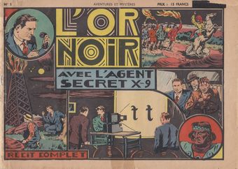 remarques: | dans la collection Aventures et Mystères numéro 5 de 1-1947, 12 pages au prix de 15.- fr grand format à l'italienne 21x30 cm les aventures de l'agent secret X-9 (un G-Man) adaptation française de l'agent secret X-9 par Alex Raymond, titre: l'or noir dans ce genre, la Sage a publié de nombreux titres tel que - Mandrake le magicien (par Phil Davis et Lee Falk) - le Fantôme (par Ray Moore et Lee Falk) - Jim la Jungle (par Briggs et Raymond) - le roi de la prairie (par Kressy et Flanders) - Amok (par Tony Chan) - Bronc Peeler (by Fred Harman) - Raoul et Gaston (par Lymand Young) - agent secret X-9 (par Alex Raymond) sans atteindre à la réputation de sa grande soeur d'avant-guerre, cette publication publia les meilleures bandes dans Paris-Jeunes aventures et connut une popularité assez considérable |